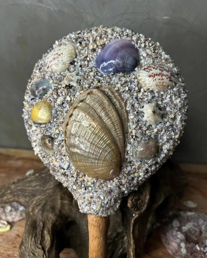 Este Abebê carrega a energia do amor e da proteção de Iemanjá. Sua forma redonda simboliza harmonia, enquanto no centro um coração se destaca, representando a força dos sentimentos e da espiritualidade. Ao redor, conchas trituradas formam um acabamento detalhado, reforçando sua conexão com o mar. O cabo de madeira traz firmeza à peça, e na parte traseira, conchas naturais adicionam um toque especial.