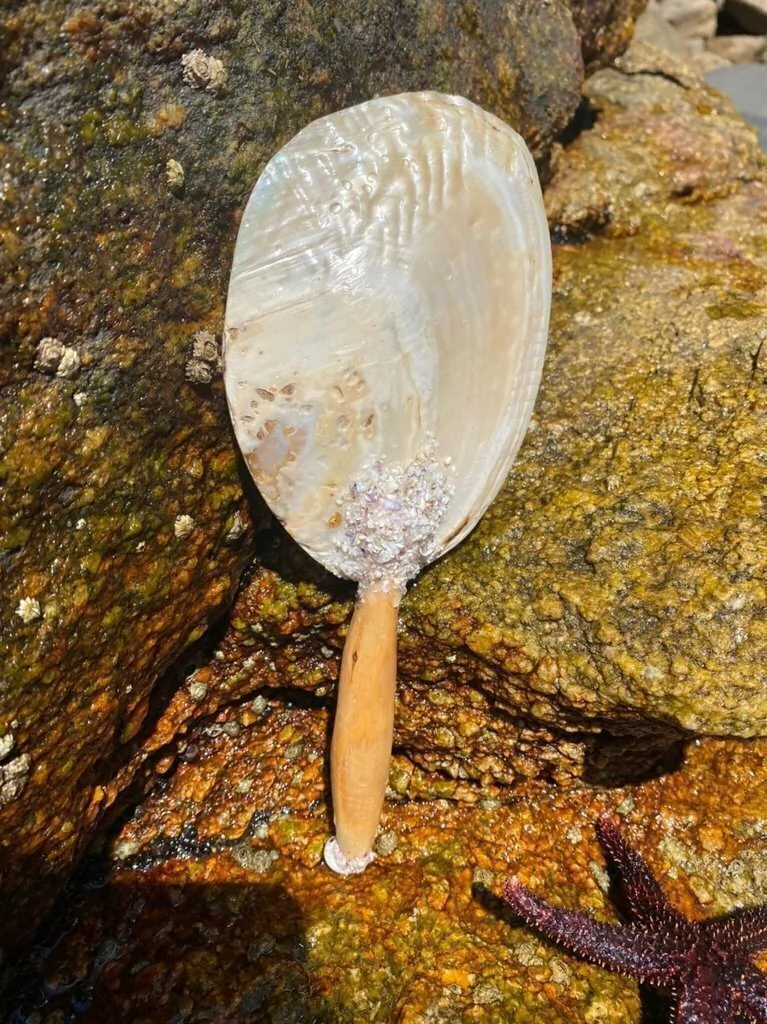Este Abebê de Iemanjá carrega a pureza e a força das águas em sua forma mais natural. Criado a partir de uma concha cuidadosamente selecionada, ele abriga em seu interior uma composição de areia, pequenas conchas e uma estrela-do-mar autêntica, refletindo toda a conexão com os oceanos e com a Rainha do Mar. O cabo de madeira, com acabamento rústico, reforça o caráter orgânico da peça, tornando-a uma verdadeira oferenda de respeito e devoção à orixá. Produzido pelo ateliê Funfun, este Abebê é uma peça única, onde a arte e a espiritualidade se encontram.