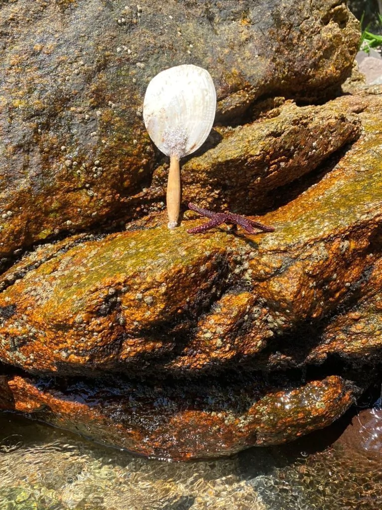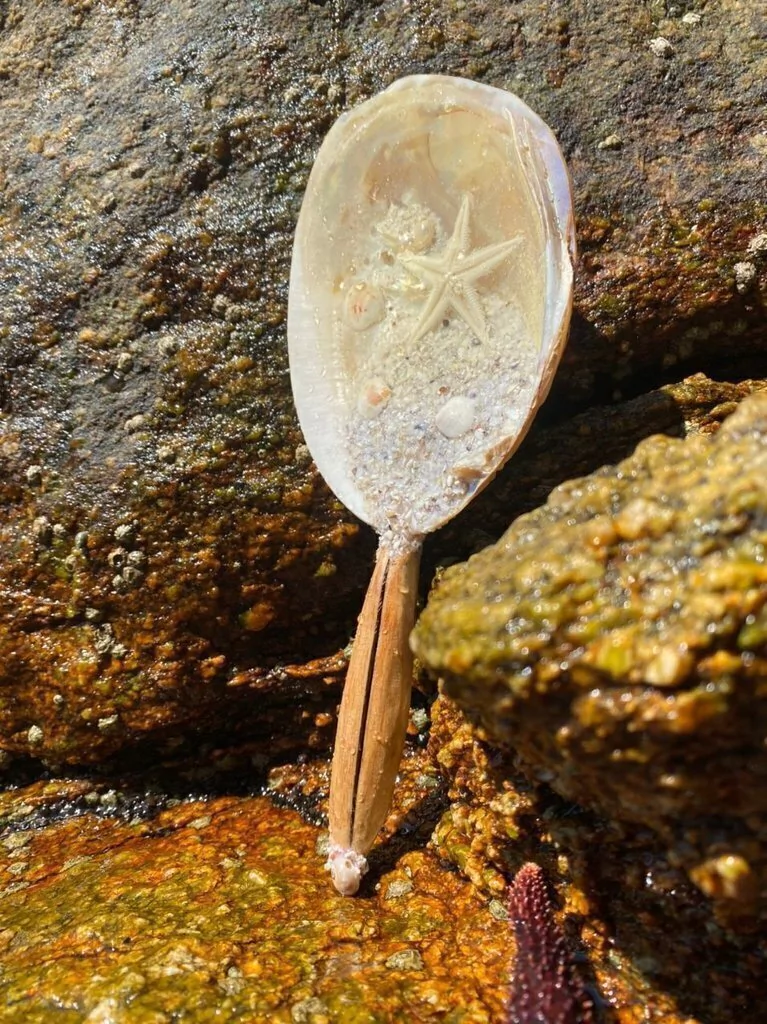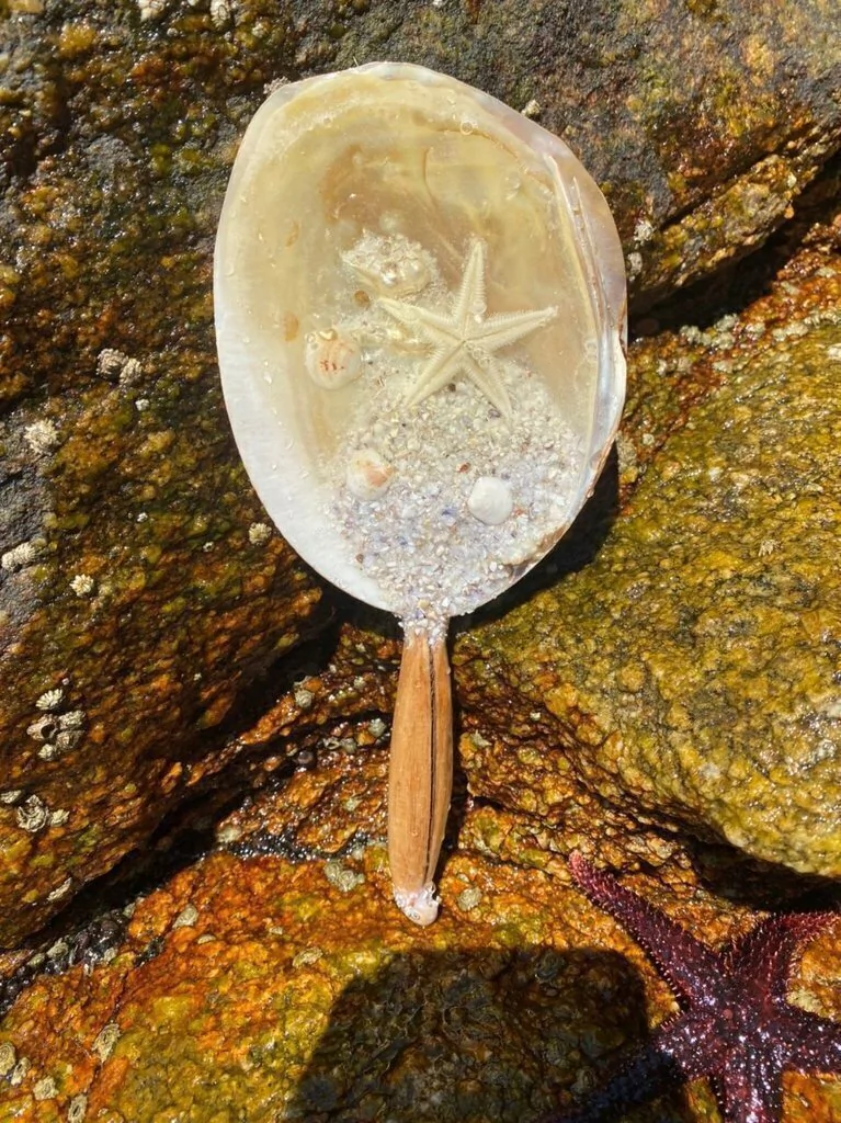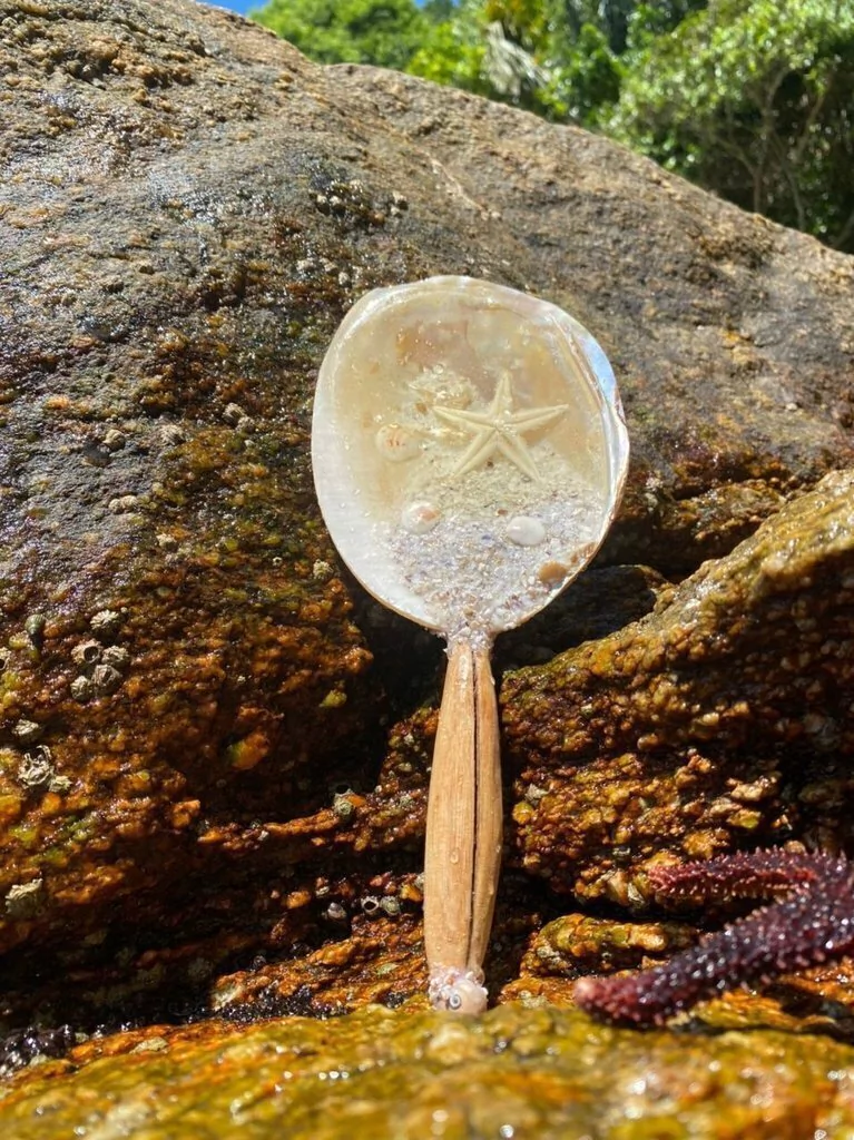 Feito com materiais naturais, combinando uma concha selecionada, areia, conchas menores, estrela-do-mar natural e cabo de madeira, garantindo uma peça autêntica e cheia de energia.