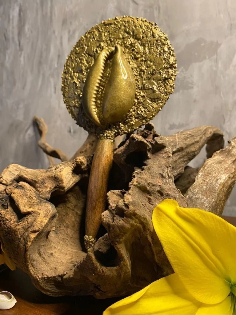 Este Abebê de Oxum resgata a essência clássica das paramentas sagradas. Com um cabo de madeira rústica à mostra, traz um toque natural e sofisticado. Sua parte superior, em formato oval, exibe uma pintura artística com movimentos dourados, representando o brilho e a fluidez da orixá. Ao redor, conchas trituradas douradas criam um acabamento detalhado, enquanto a parte traseira conta com um búzio também pintado em dourado, reforçando sua conexão com Oxum.