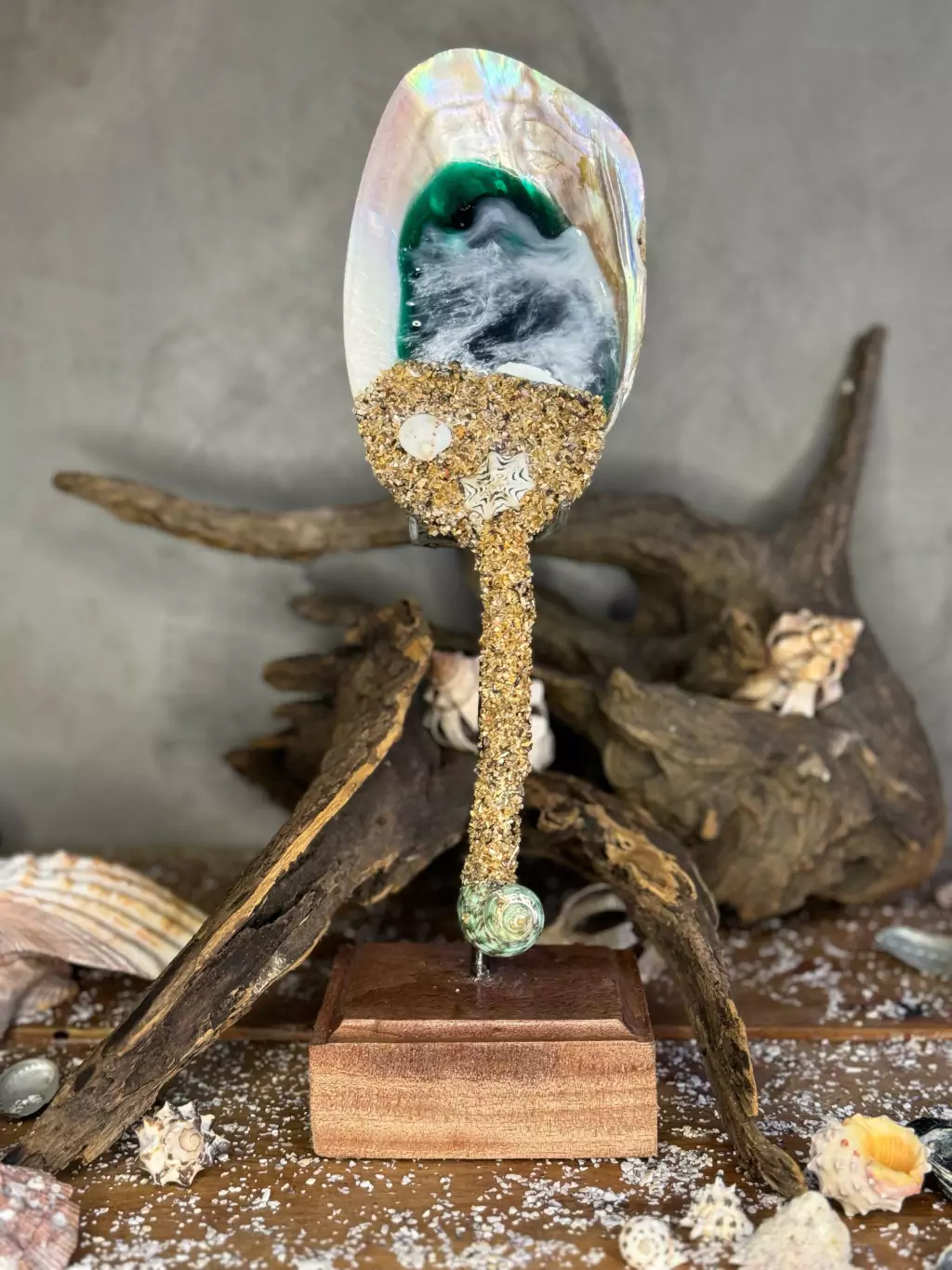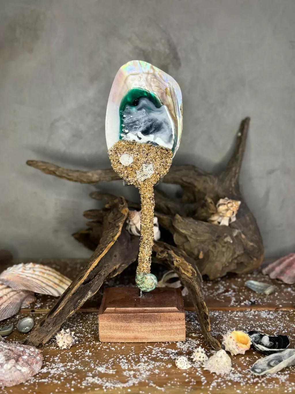 O Abebê de Iemanjá é um símbolo de realeza e conexão espiritual, representando a força e a fluidez das águas. Diferente dos espelhos tradicionais, esta peça é feita a partir de uma concha natural, trazendo em sua superfície uma pintura artística que remete ao mar, evocando a energia e o mistério da mãe dos oceanos. Criado pelo ateliê Funfun, este Abebê carrega a essência das águas sagradas, sendo ideal para rituais e cultos à Iemanjá.
