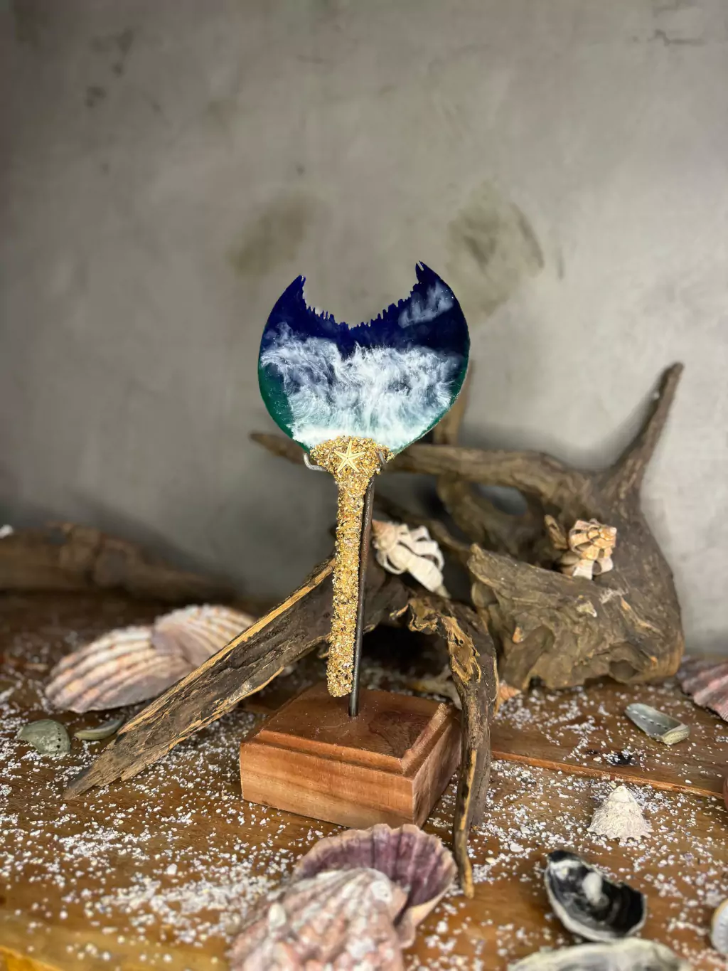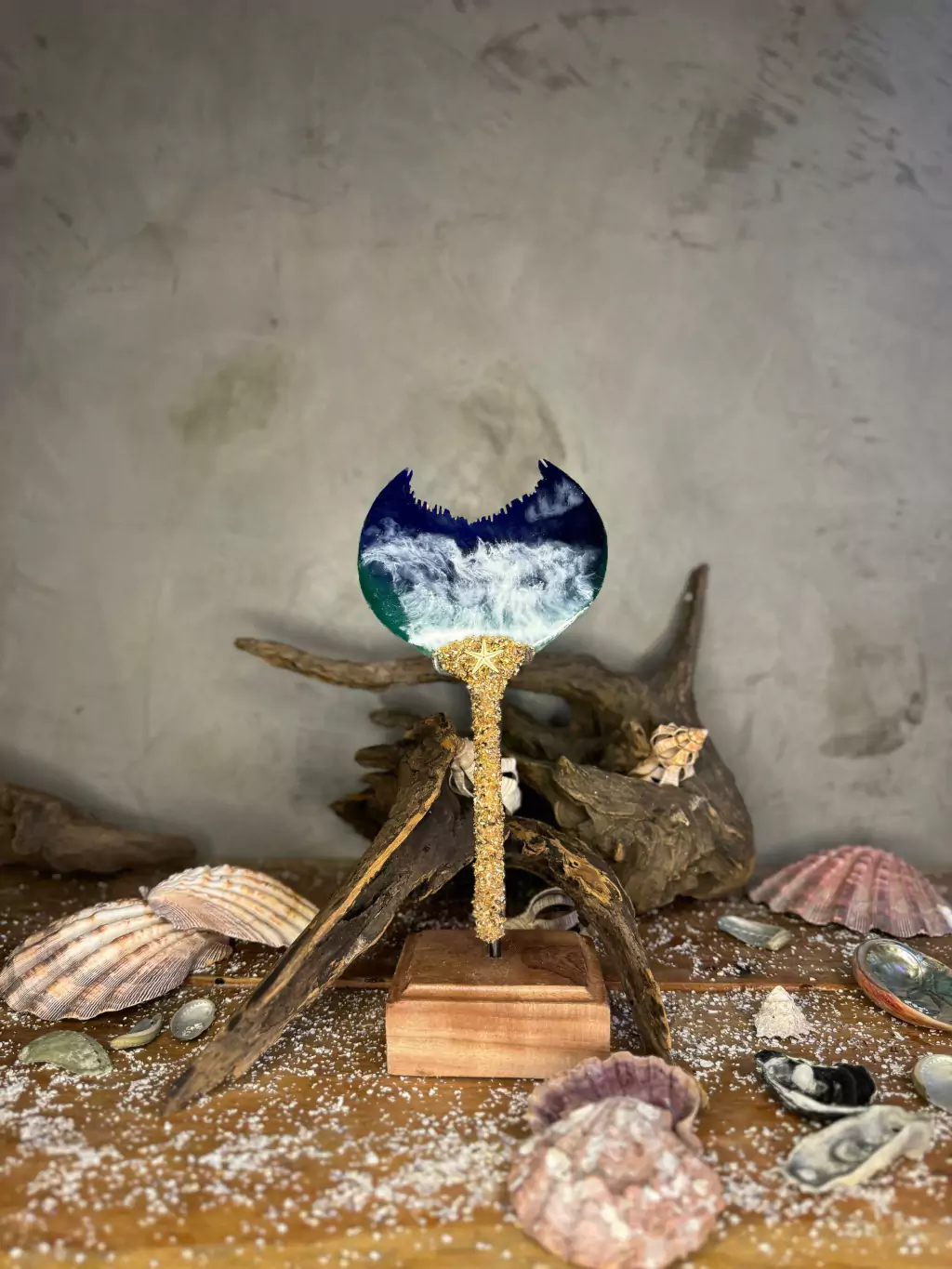Este Abebê de Iemanjá é uma peça única, carregada da força e do mistério das águas. Diferente dos modelos tradicionais, ele não contém espelho, mas sim uma concha especial com uma pintura que remete ao movimento das ondas do mar, refletindo a energia da orixá com profundidade e beleza. Criado pelo ateliê Funfun, cada detalhe dessa peça carrega a grandiosidade da Rainha do Mar.