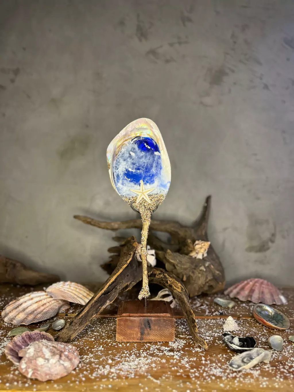 Este Abebê de Iemanjá é uma obra única, que traz o mistério e a força das águas. Ao invés do tradicional espelho, a peça é adornada por uma concha especial com pinturas que evocam o movimento das ondas do mar, refletindo a majestade de Iemanjá de forma profunda e cheia de beleza. Além disso, uma estrela-do-mar natural, cuidadosamente selecionada, complementa a composição, simbolizando a conexão com os oceanos e a proteção da Rainha do Mar. Criada pelo ateliê Funfun, essa peça carrega em cada detalhe a grandiosidade da orixá.