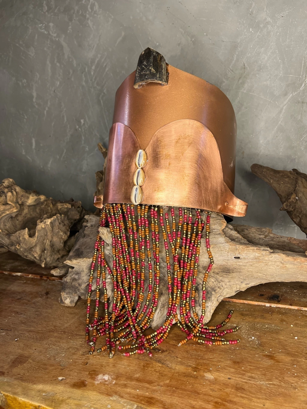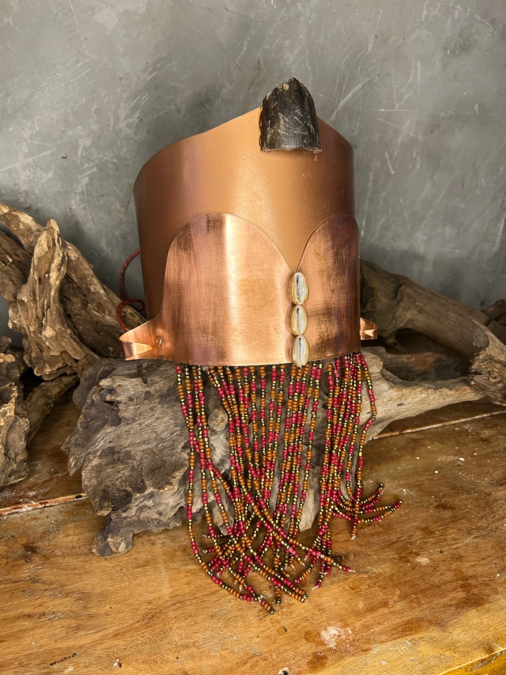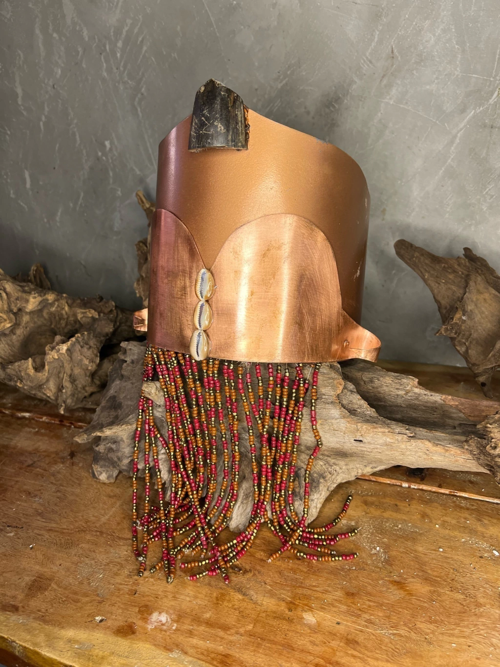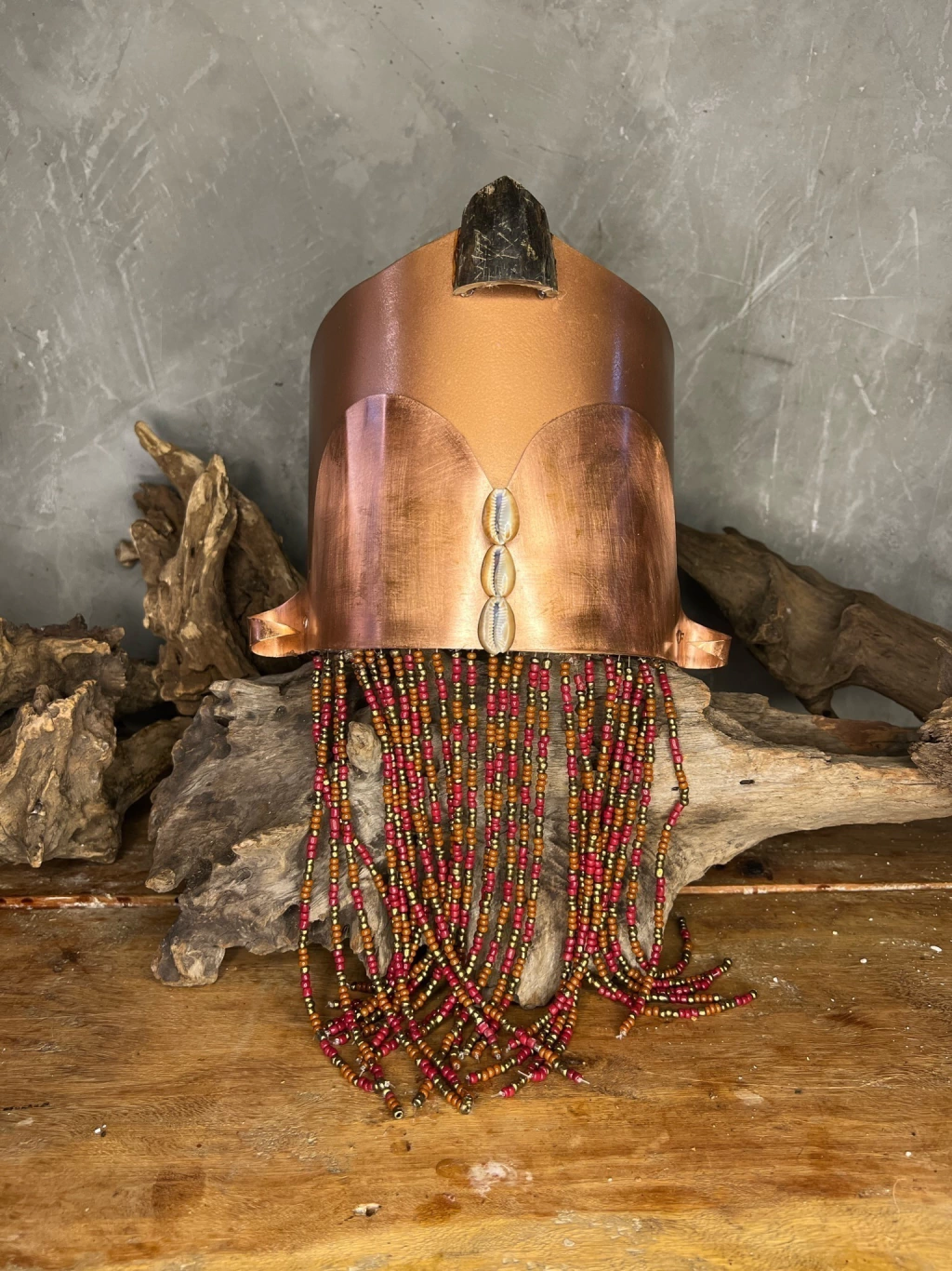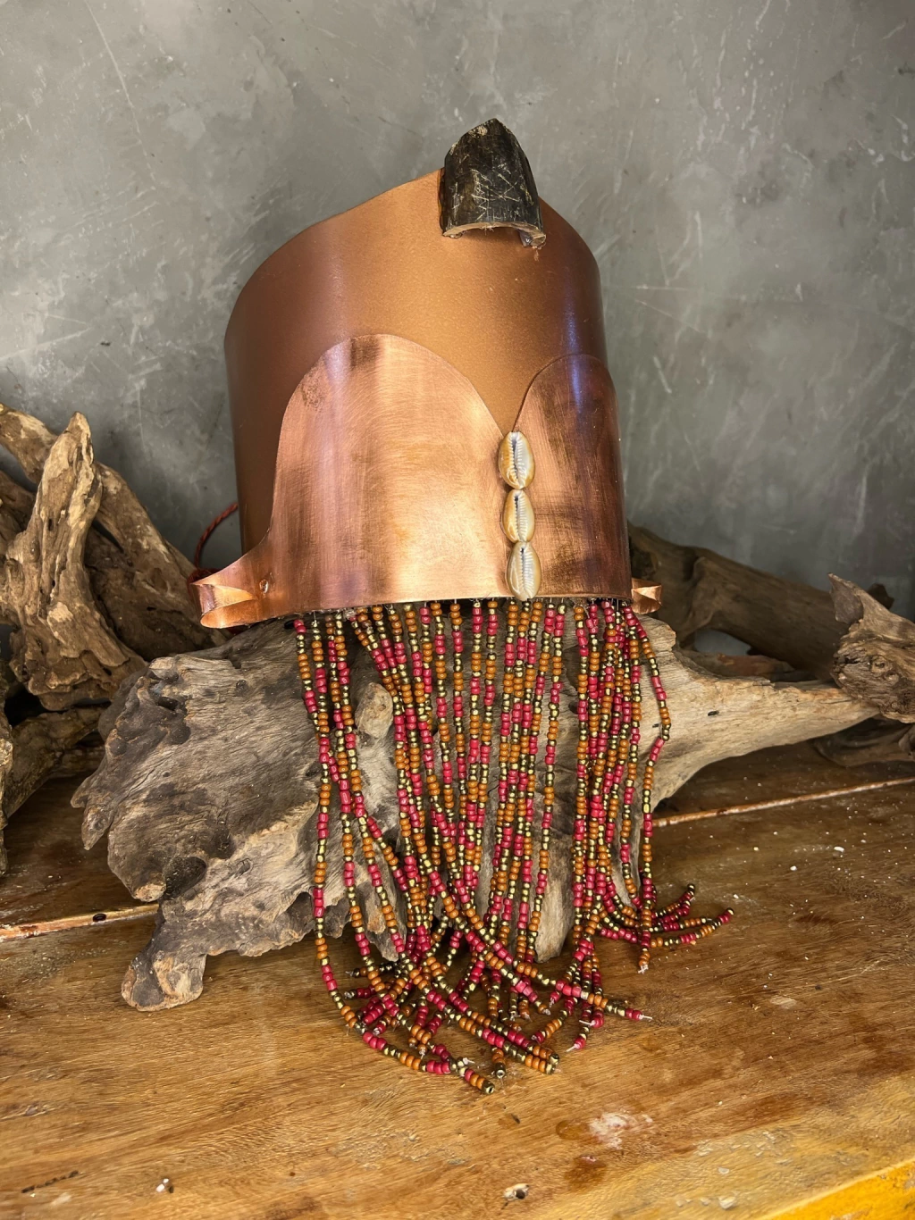 Este imponente Adê de Iansã traduz a energia vibrante da senhora dos ventos e tempestades. Com acabamento em tom cobre e detalhes artesanais, a peça exibe um fragmento de chifre no topo, simbolizando bravura e liderança. Os búzios reforçam a conexão com os mistérios do vento, enquanto as franjas de contas em tons quentes evocam o movimento constante de Oyá.