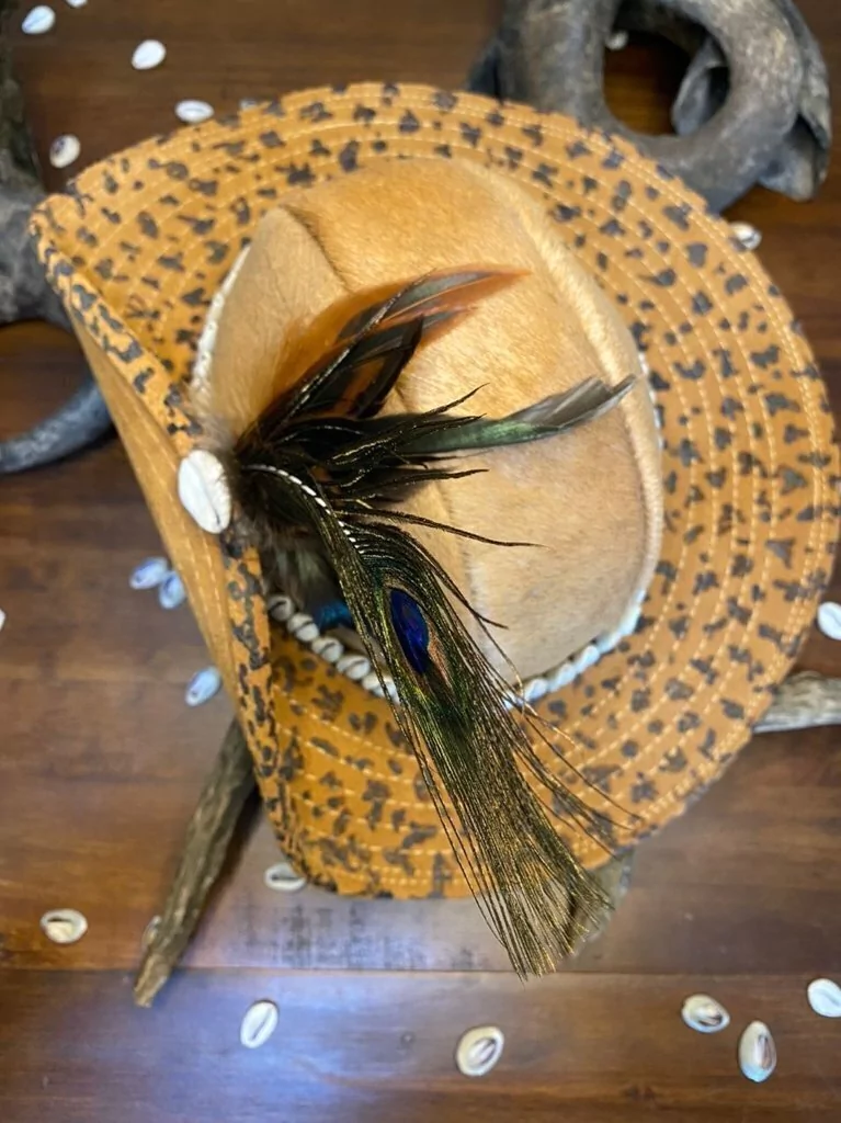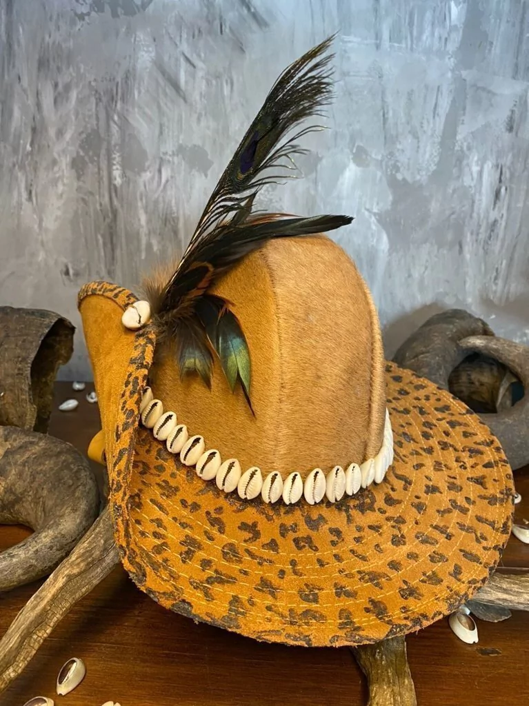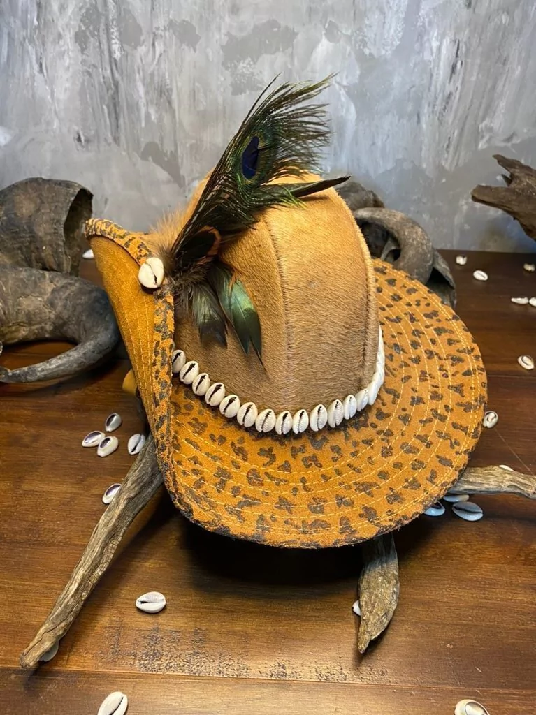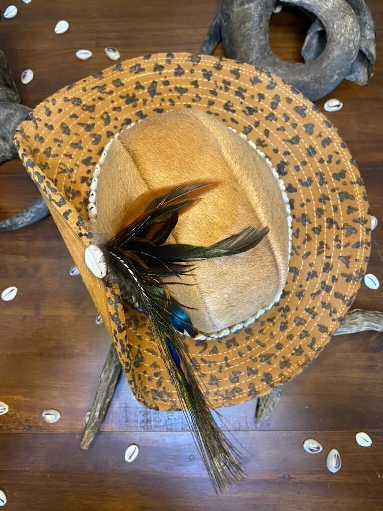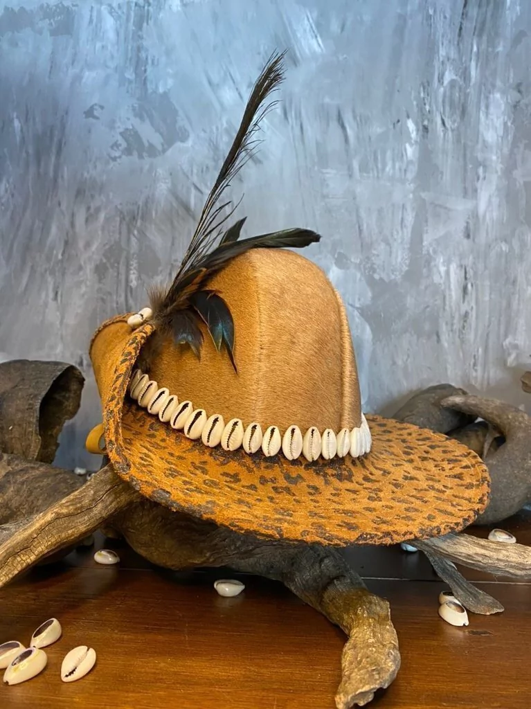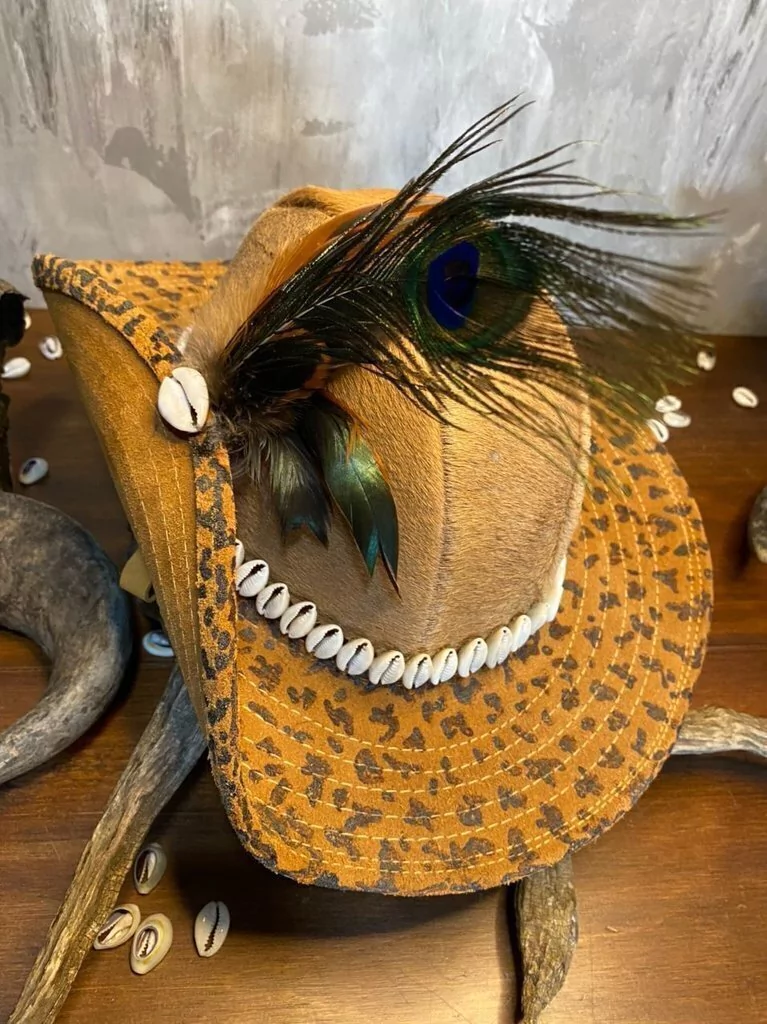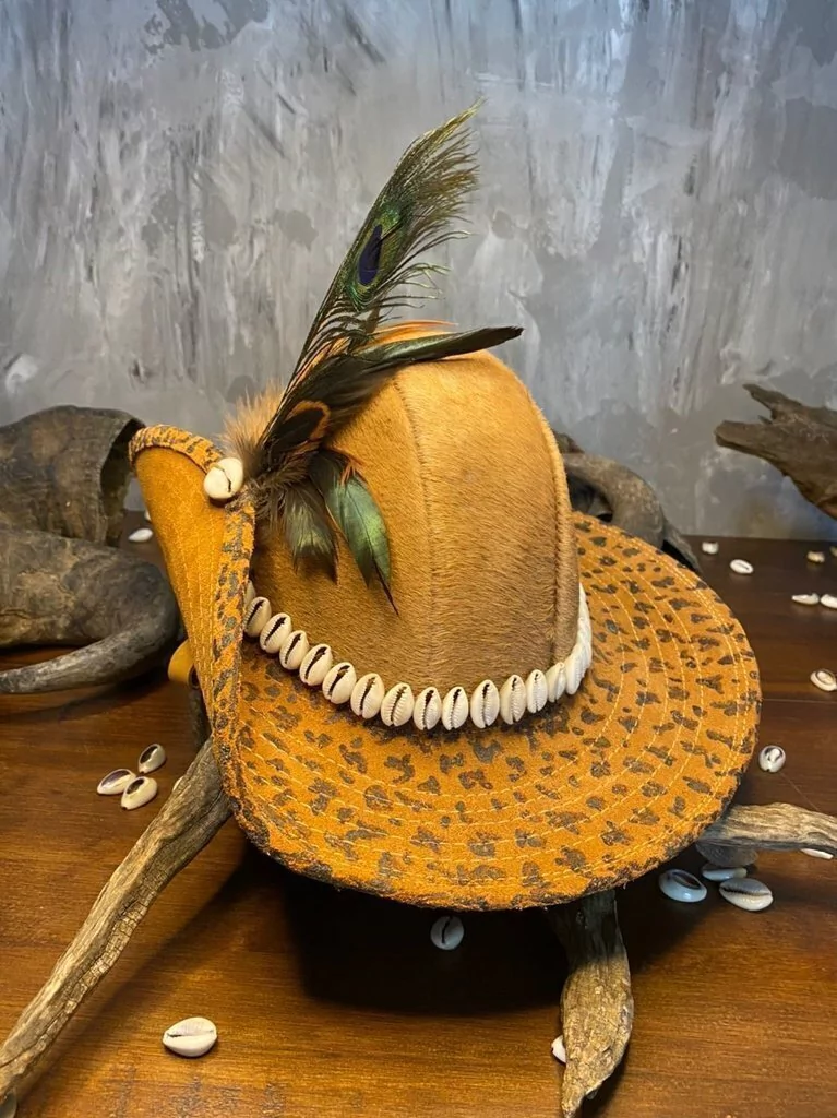 A aba possui uma coloração que remete à pele de onça, enquanto o cone é feito de pelo animal, trazendo um toque autêntico e natural. A fita ao redor do chapéu é adornada com búzios, simbolizando a prosperidade e a proteção. Para finalizar, uma pena média de pavão enfeita o lado dobrado da aba, reforçando a majestade do grande caçador.