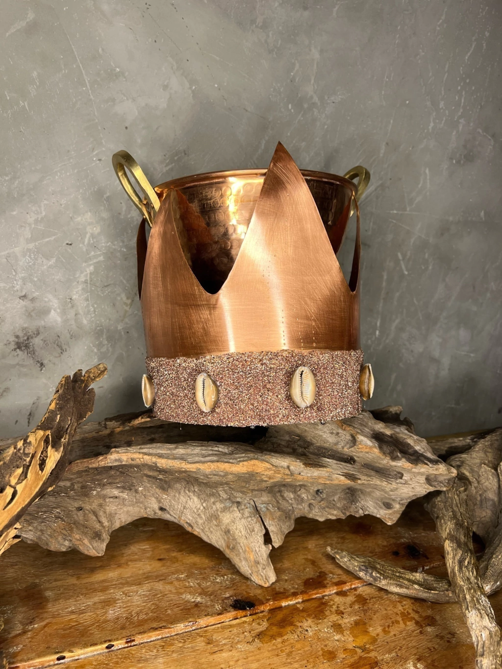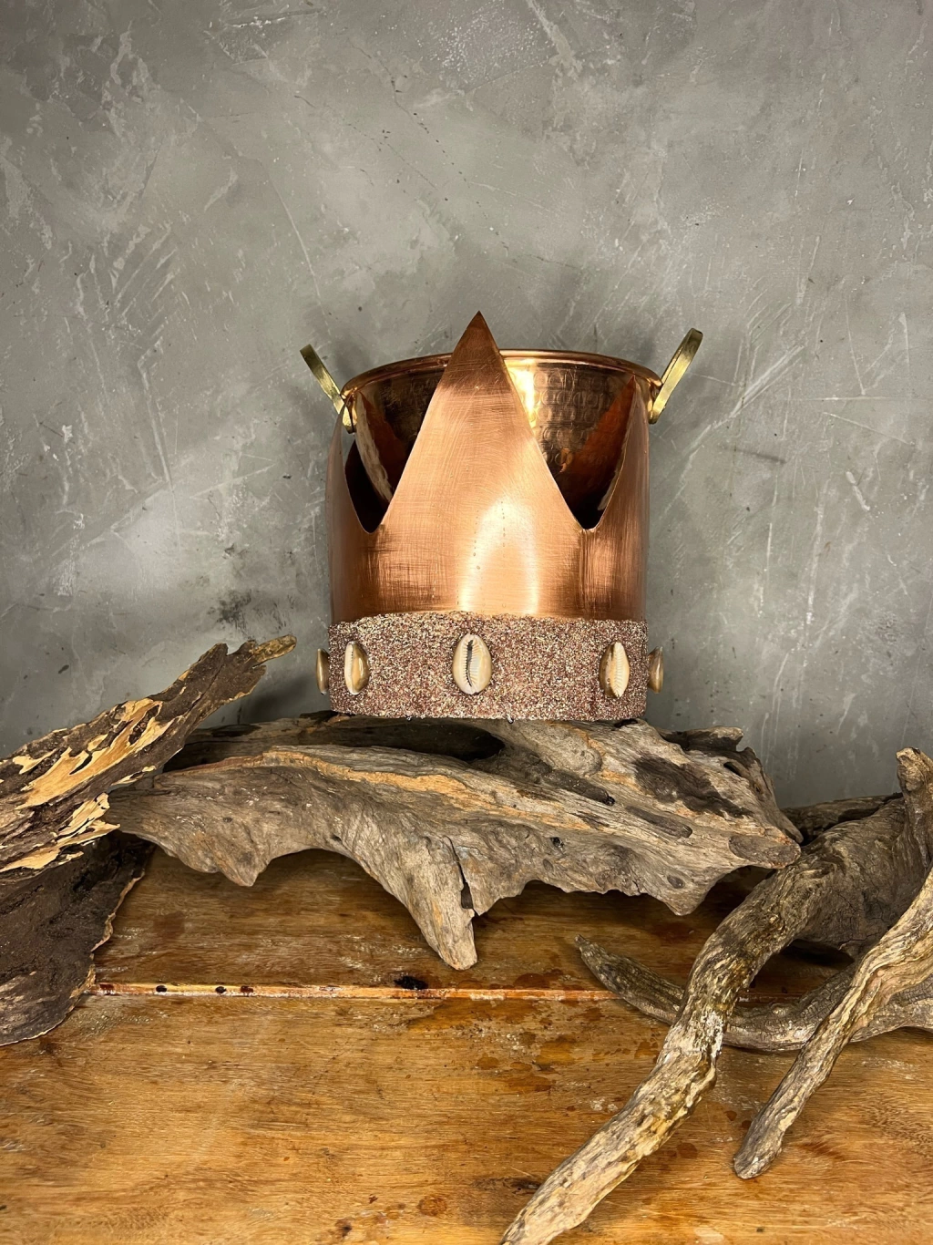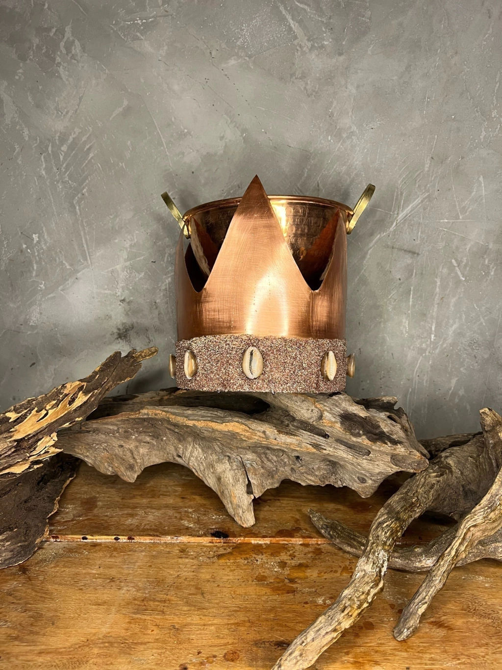 Este Adê de Xangô, confeccionado em cobre, destaca-se pelo formato de coroa com recortes triangulares na parte superior, refletindo a imponência e a nobreza do Orixá. Na base, búzios adornam a peça, reforçando sua ligação com as tradições ancestrais.