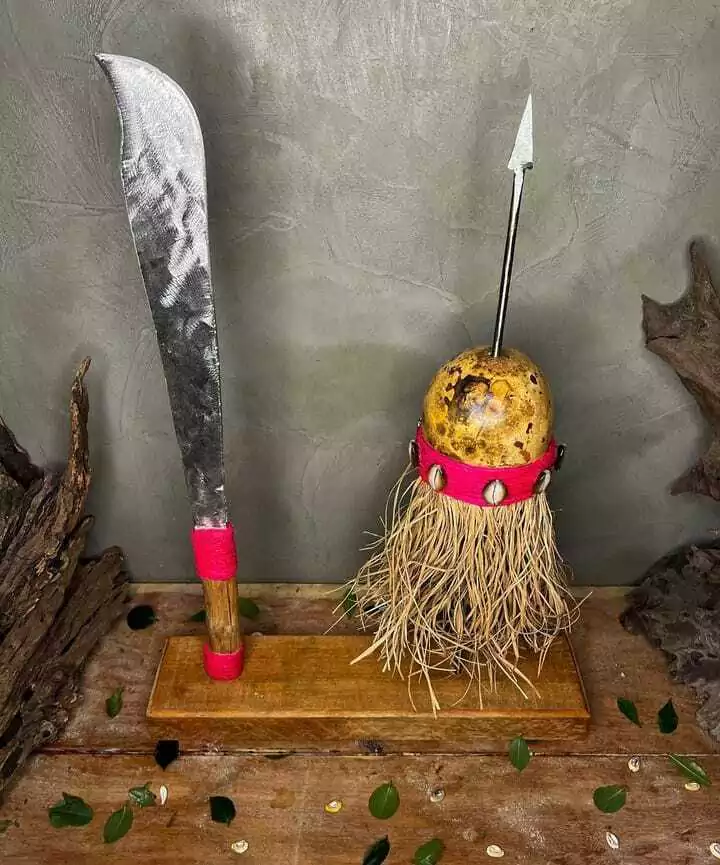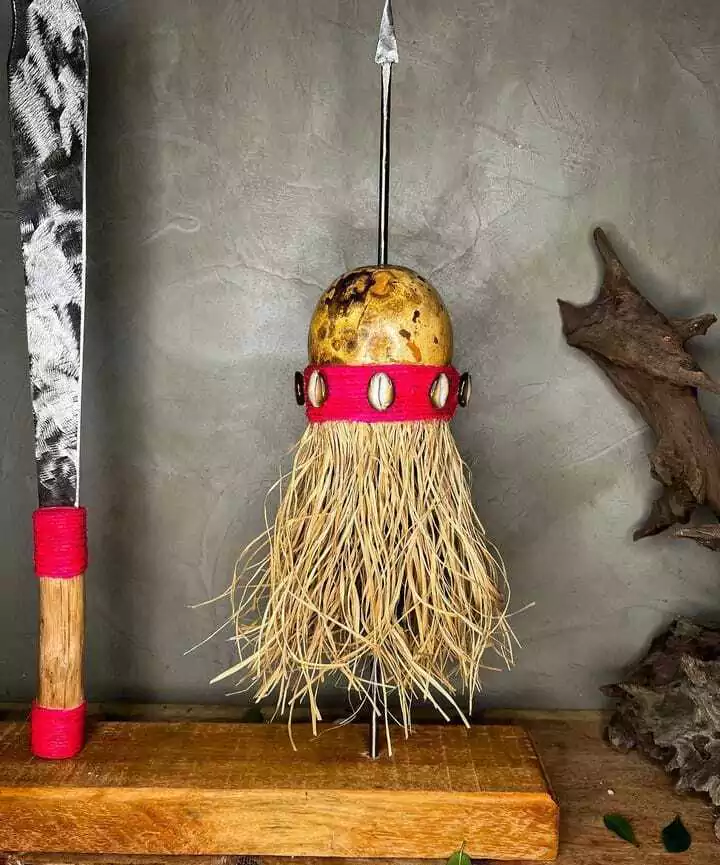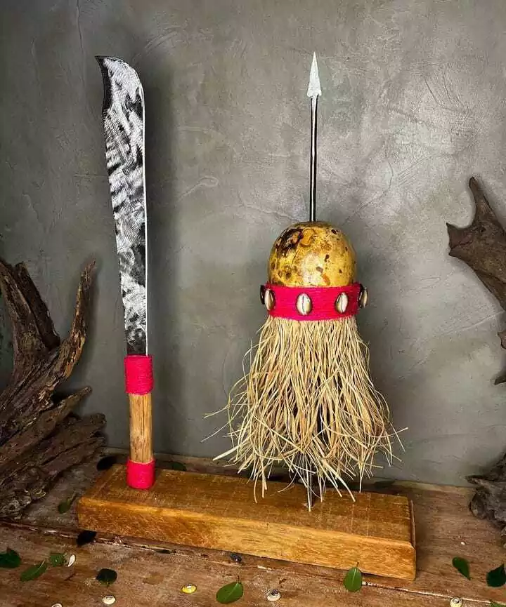 O Conjunto de Ewá com Alfange e Adô Arakolê resplandece o mistério e a beleza encantada da senhora das neblinas. Símbolos de proteção, agilidade e sabedoria, essas peças invocam o poder da visão além dos véus e da pureza que transforma caminhos. Cada detalhe reverbera o axé da coragem delicada e da força sutil que somente Ewá domina.