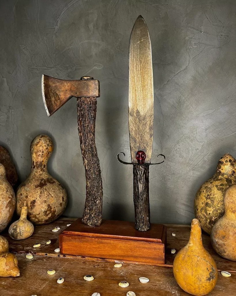 Este conjunto de Exu une o Obé e o Machado como expressões complementares de força e decisão. O Obé - lâmina do corte justo - simboliza a sabedoria para discernir e transformar. O Machado - ferramenta de imposição e justiça - representa o poder de afirmar caminhos com coragem e determinação. Obras artesanais que reverenciam o Exu que protege, renova e firma os destinos.
