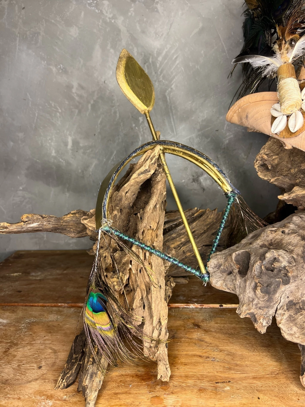 Adornado com a força da coroa, da flecha e do espelho, este conjunto celebra a totalidade do axé de Logunedé. União perfeita entre a juventude sábia e a coragem ancestral.