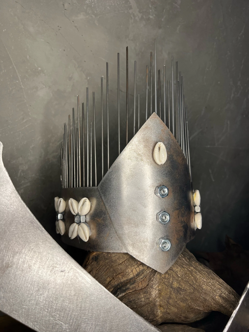 • Coroa: Metal trabalhado com aplicação de búzios e detalhes em aço.