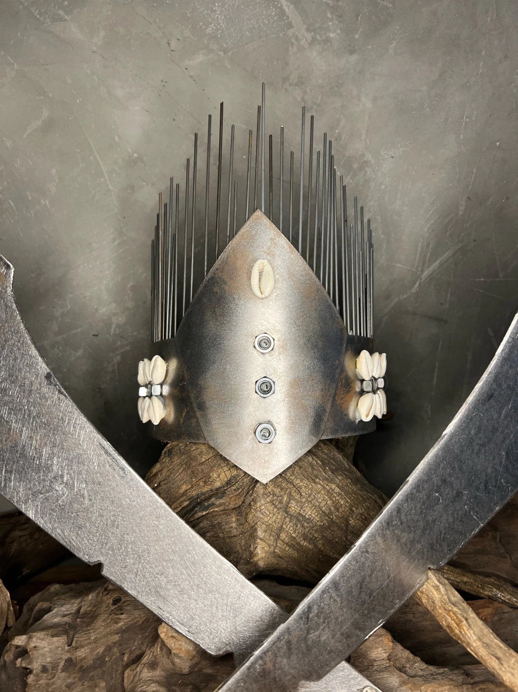 Um conjunto digno do grande guerreiro dos caminhos e batalhas. Este kit exclusivo traz dois alfanges de aço forjado, cada um com detalhes únicos, e uma imponente coroa de metal ornamentada com búzios e hastes metálicas, refletindo o poder e a realeza de Ogum.