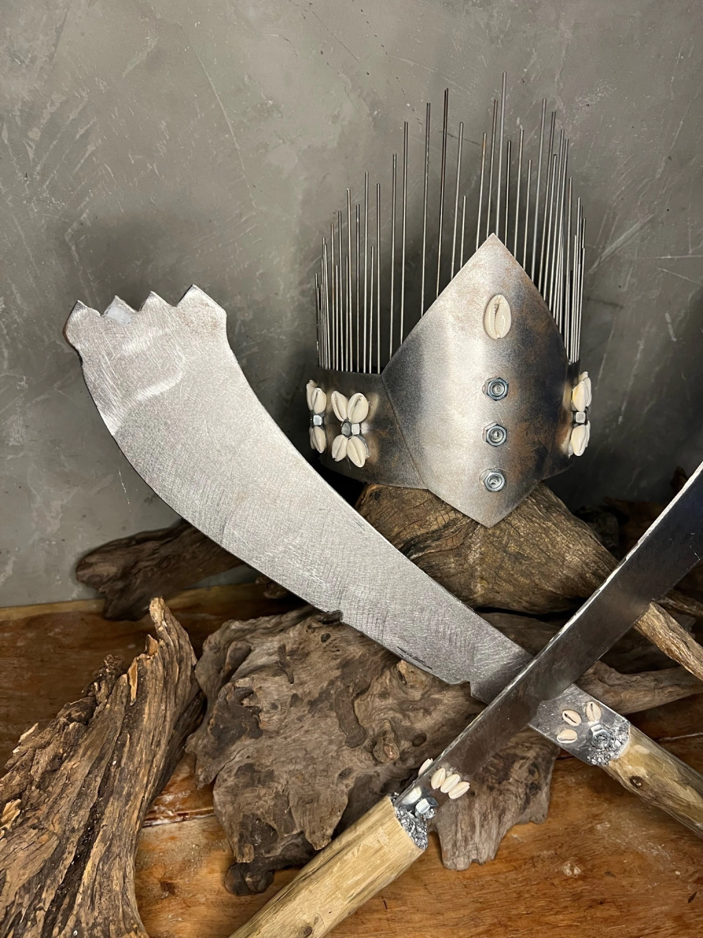 • Alfanges: Aço forjado com cabos de madeira rústica, decorados com búzios e acabamentos metálicos.