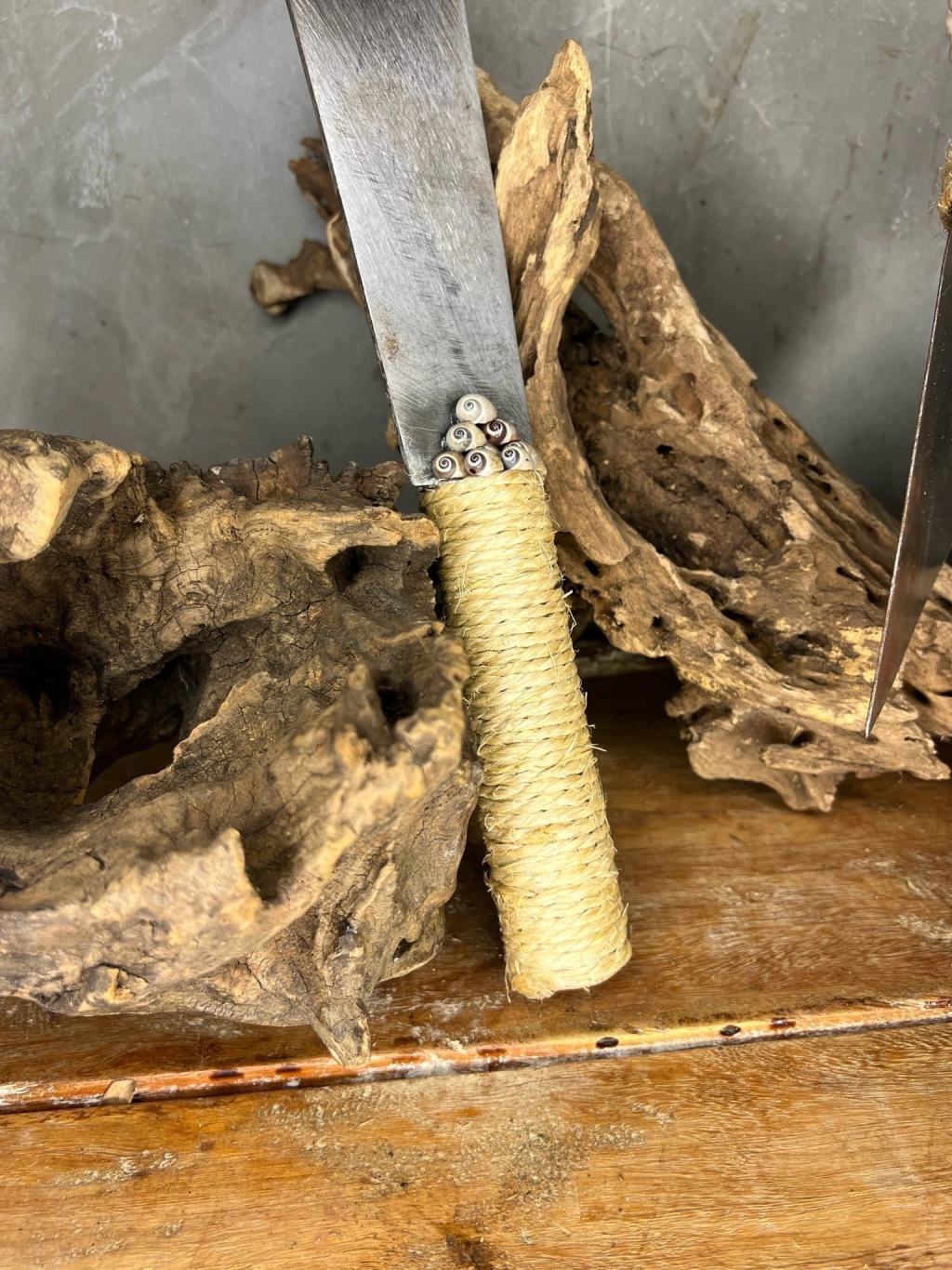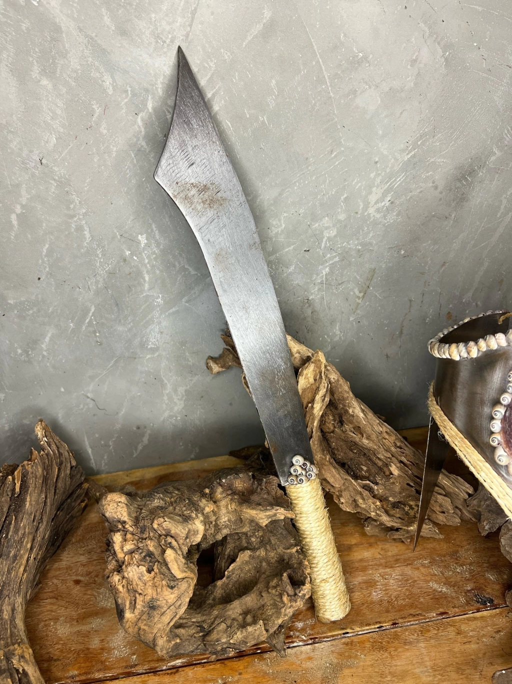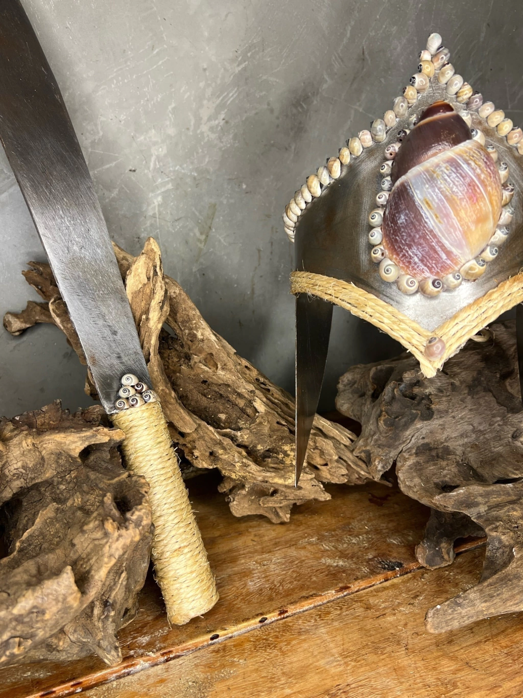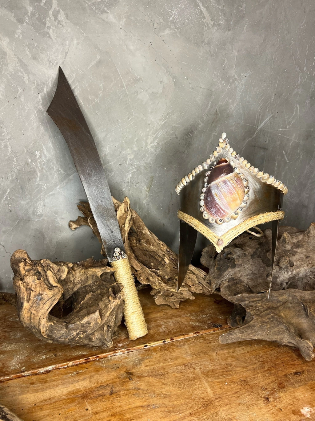 O Conjunto de Oxaguiã reúne o Adê e o Alfange como símbolos da nobreza jovem e da ação serena. O Adê - coroa da realeza e da força sagrada - honra o domínio espiritual de Oxaguiã. O Alfange - lâmina curva de decisão e movimento - representa o corte suave e a abertura dos caminhos retos. Cada peça é feita artesanalmente para reverenciar o Oxalá jovem, senhor da paz ativa e da esperança renovadora.