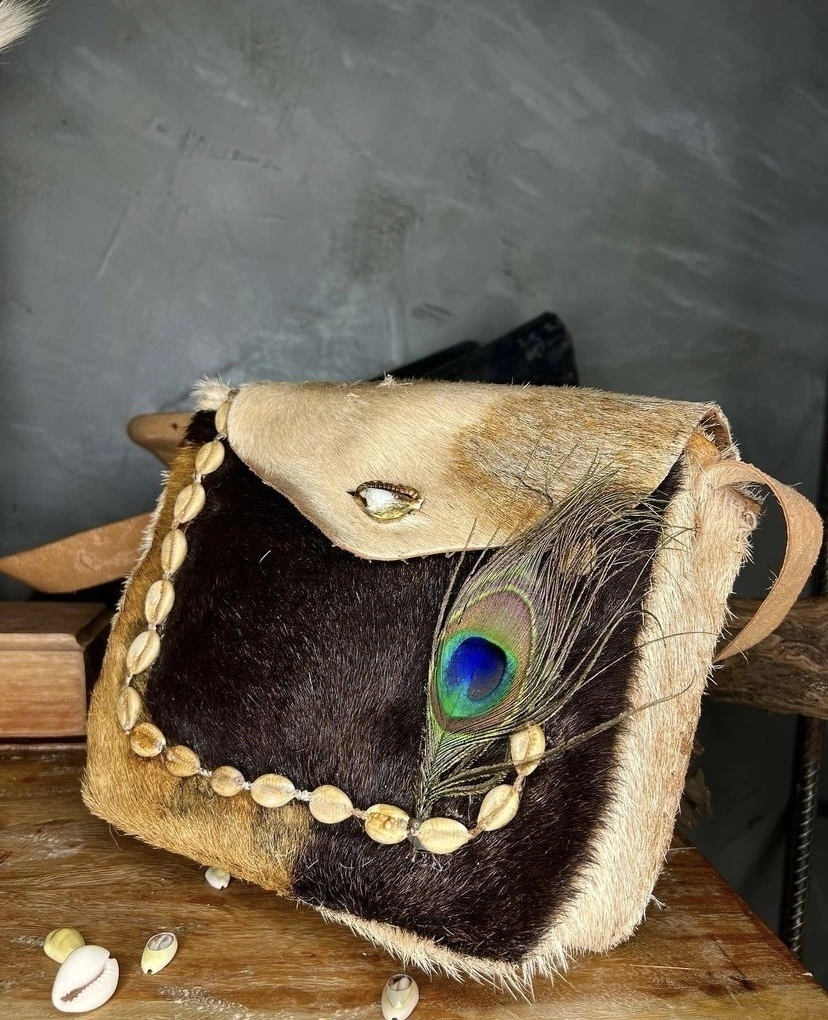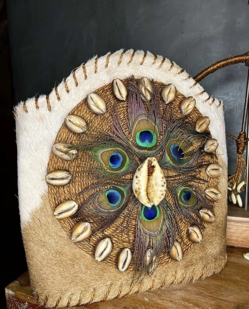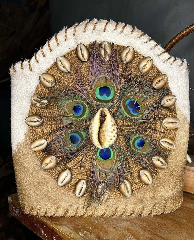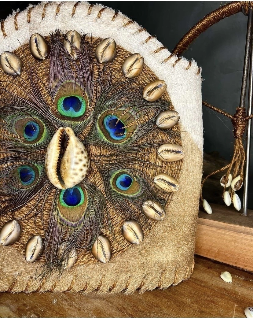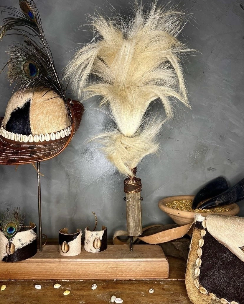 Sisal, cauda de boi, pelo animal, búzios, pena de pavão e madeira.