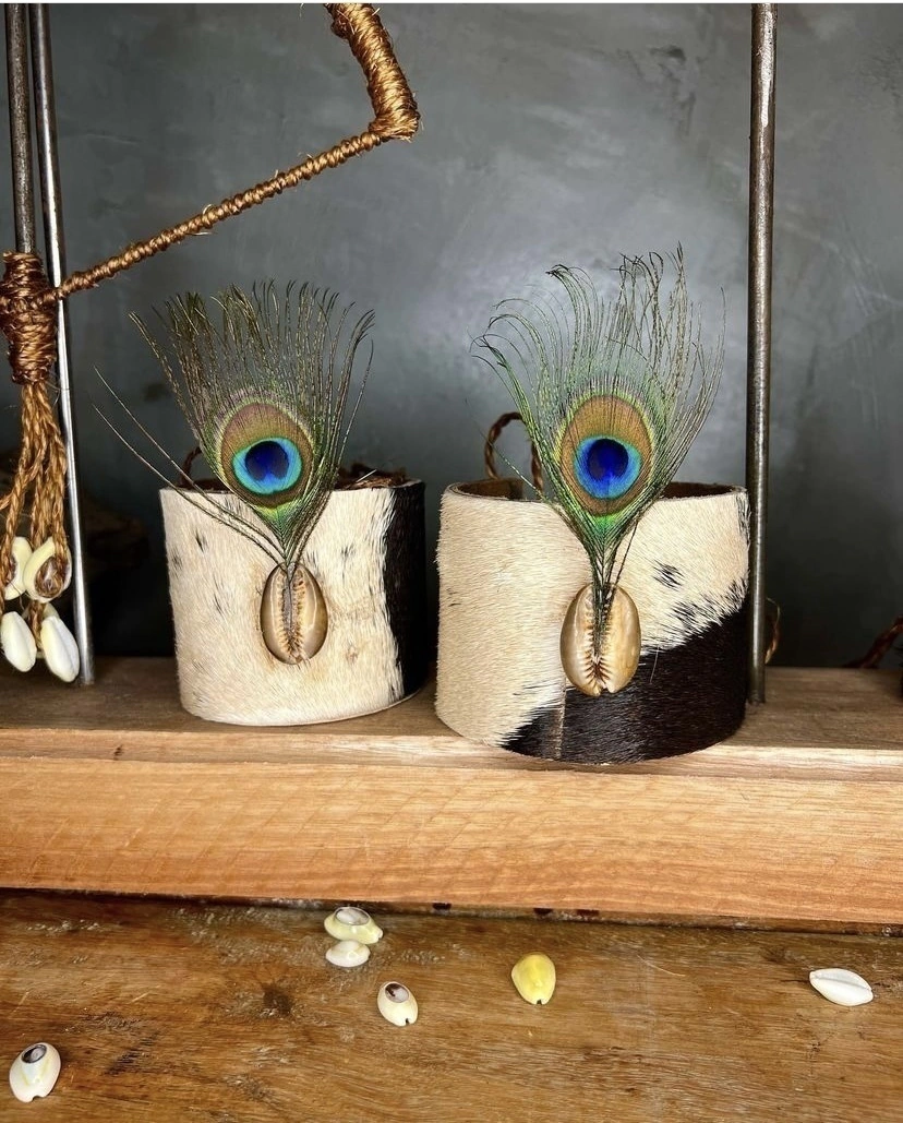 Revestidos com pelo animal, os braceletes são adornados com penas de pavão e búzios, trazendo a sofisticação e conexão espiritual com Oxóssi.