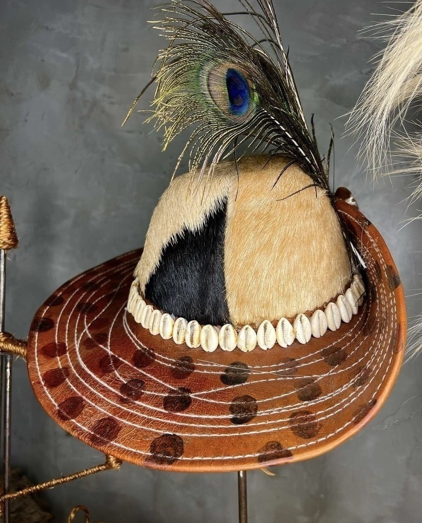 Estilo safari, com três penas de pavão (uma grande no centro e duas médias nas laterais) e um búzio na parte interna da dobra, destacando a nobreza e poder de Oxóssi.