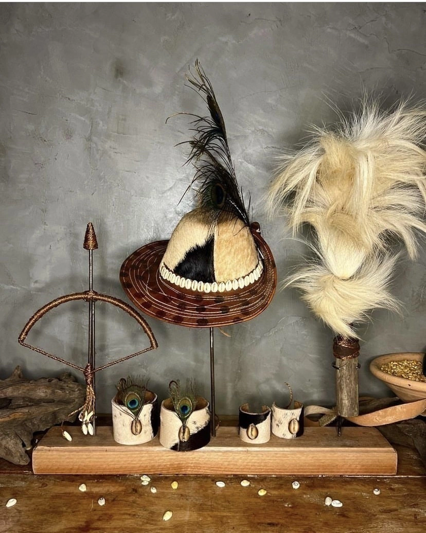 Conjunto de Oxóssi com Chapéu, Capanga, Ofá, Erukerê, Peitaça, Braceletes e Pulseiras