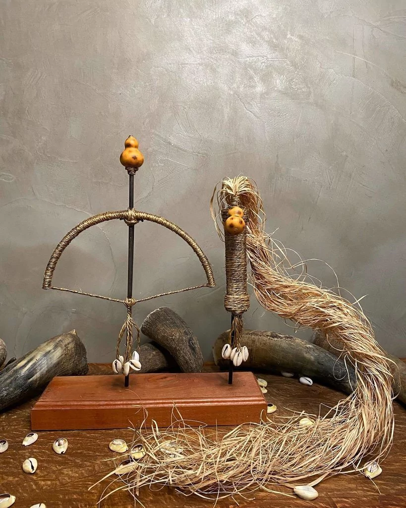 O arco é revestido em fio de sisal natural, mantendo um acabamento rústico e tradicional. Na extremidade traseira, búzios estão pendurados em fios de sisal, trazendo a energia da caça e da prosperidade. A ponta da flecha conta com uma pequena cabaça, reforçando sua ligação com a abundância e o axé de Oxóssi.