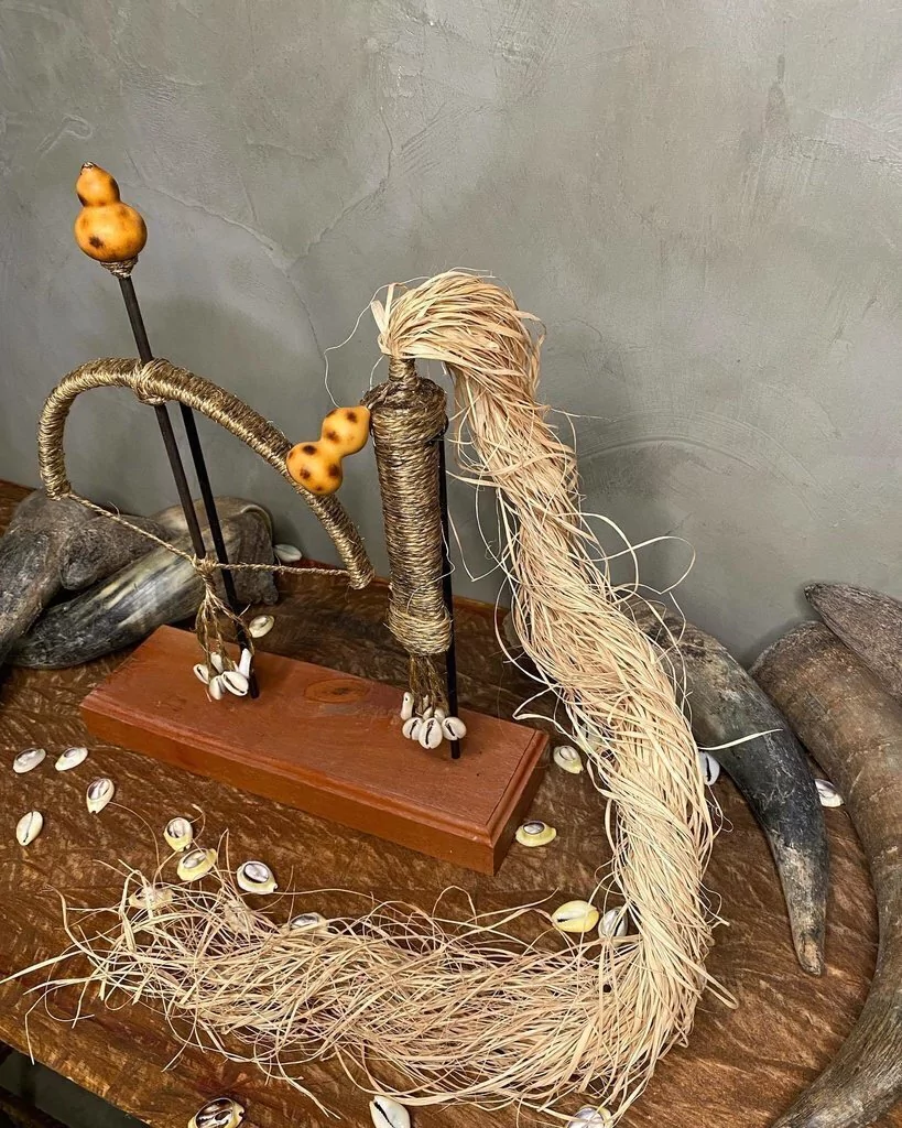 Sisal natural, madeira, búzios, cabaça e palha da Costa.