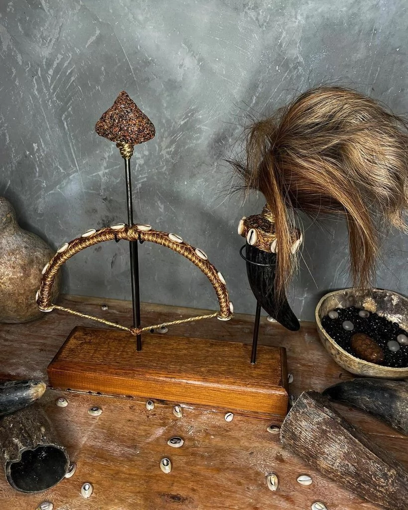 O arco é revestido em sisal e decorado com búzios, trazendo um acabamento rústico e autêntico. A flecha possui ponta de pedra, reforçando a presença imponente do orixá.