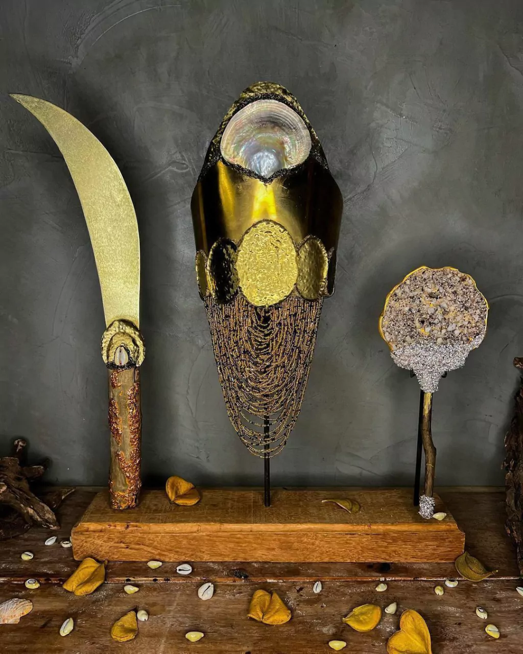 O Adê possui acabamento dourado, búzios, conchas trituradas e uma grande concha madrepérola no topo, simbolizando o poder de Oxum sobre as águas e sua realeza. O Abebê é feito com uma concha madrepérola, cabo de madeira e acabamento em conchas e pedras trituradas, trazendo um toque único e sofisticado. O Alfange tem lâmina dourada e cabo de madeira, que é coberto por conchas trituradas, representando a força guerreira da orixá.