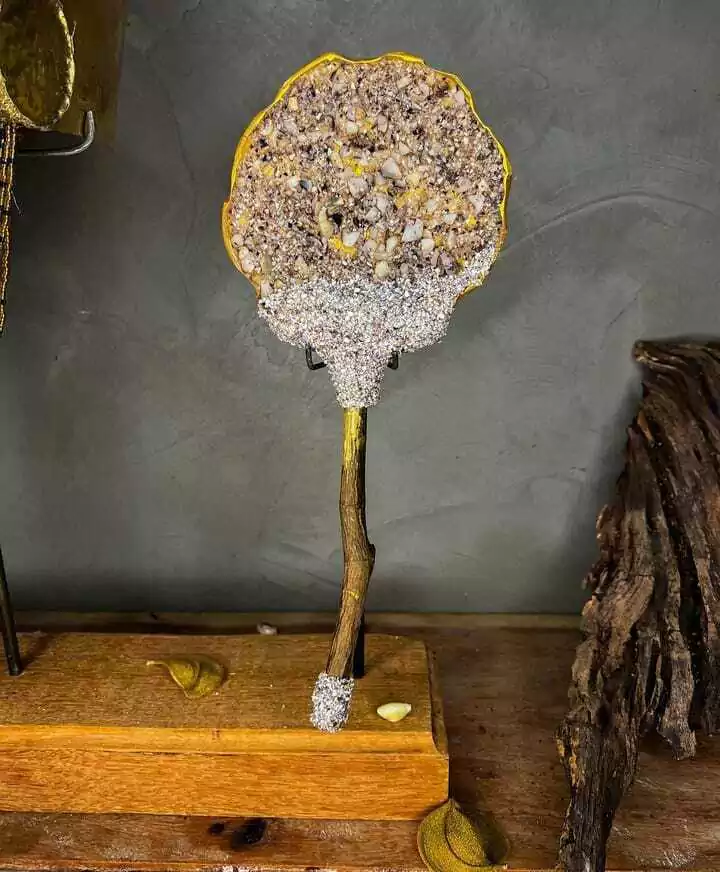 Metal dourado, conchas trituradas, búzios, concha madrepérola, pedras trituradas e madeira.