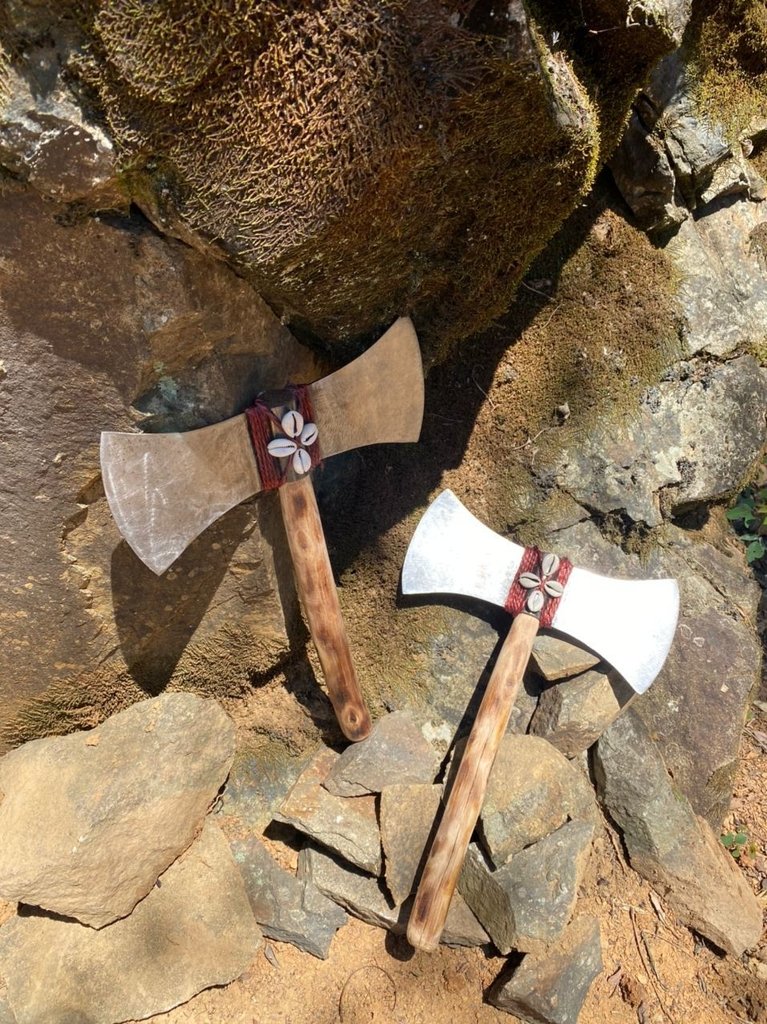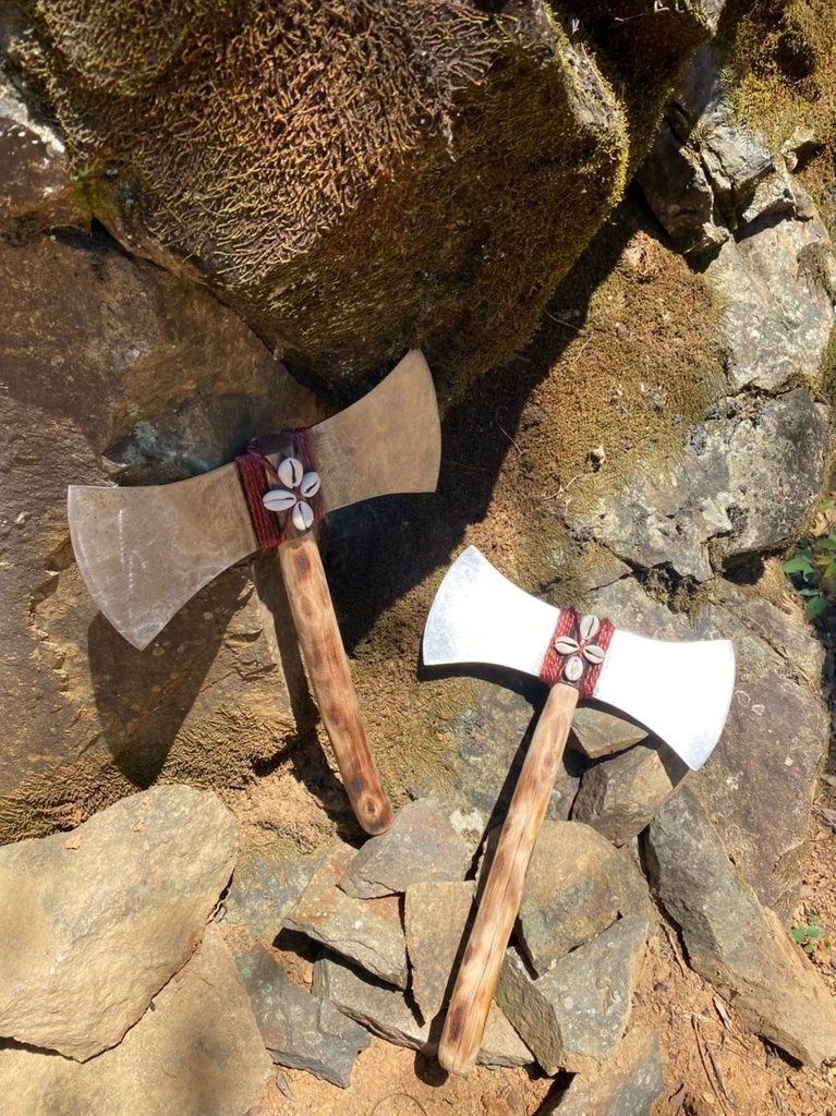 Representando a força e a justiça de Xangô, este conjunto de Oxês de dois lados de corte carrega a energia do Orixá em cada detalhe. As lâminas apresentam um acabamento envelhecido, enquanto o centro é adornado com búzios e fios, evocando tradição e ancestralidade.