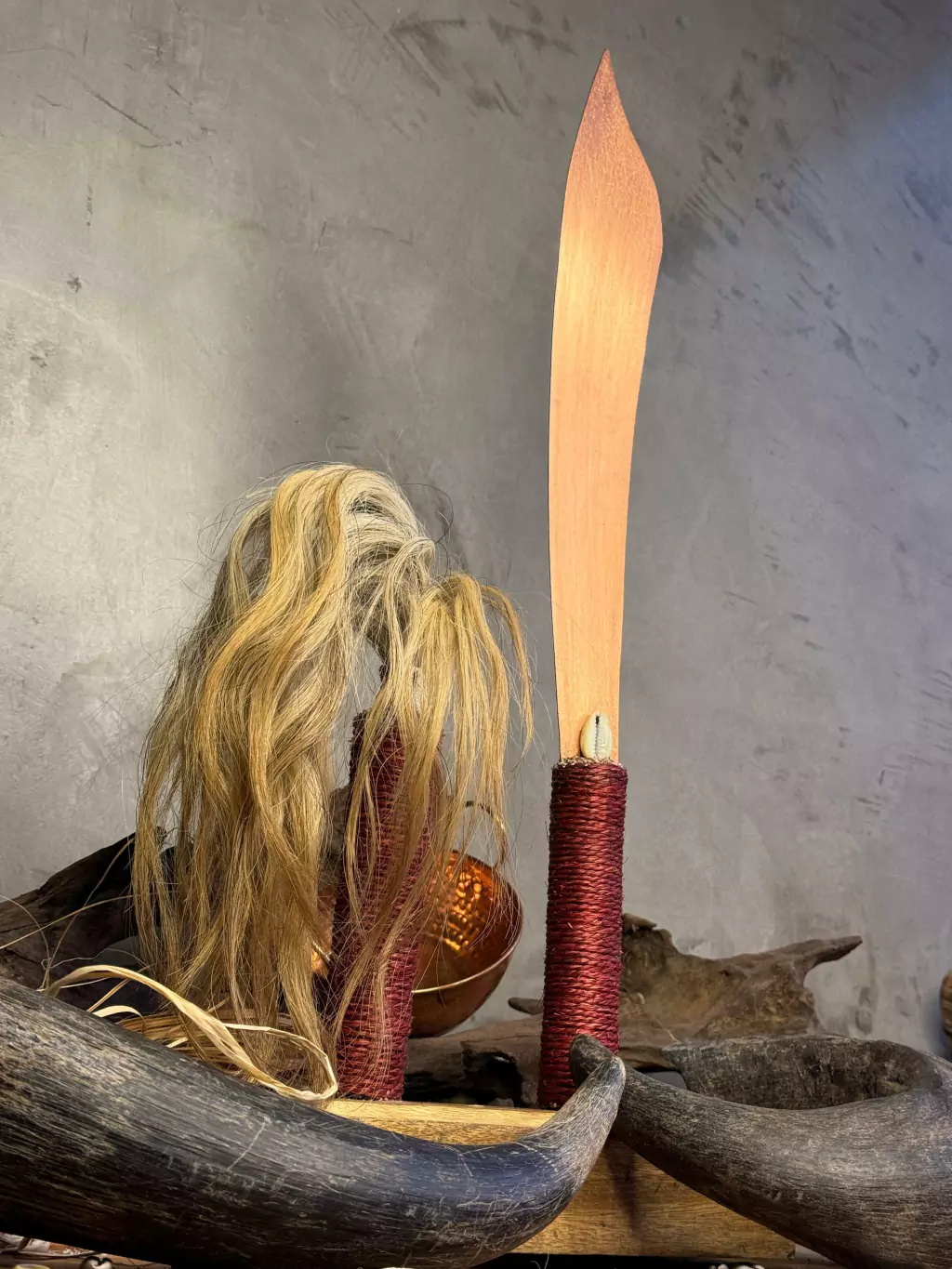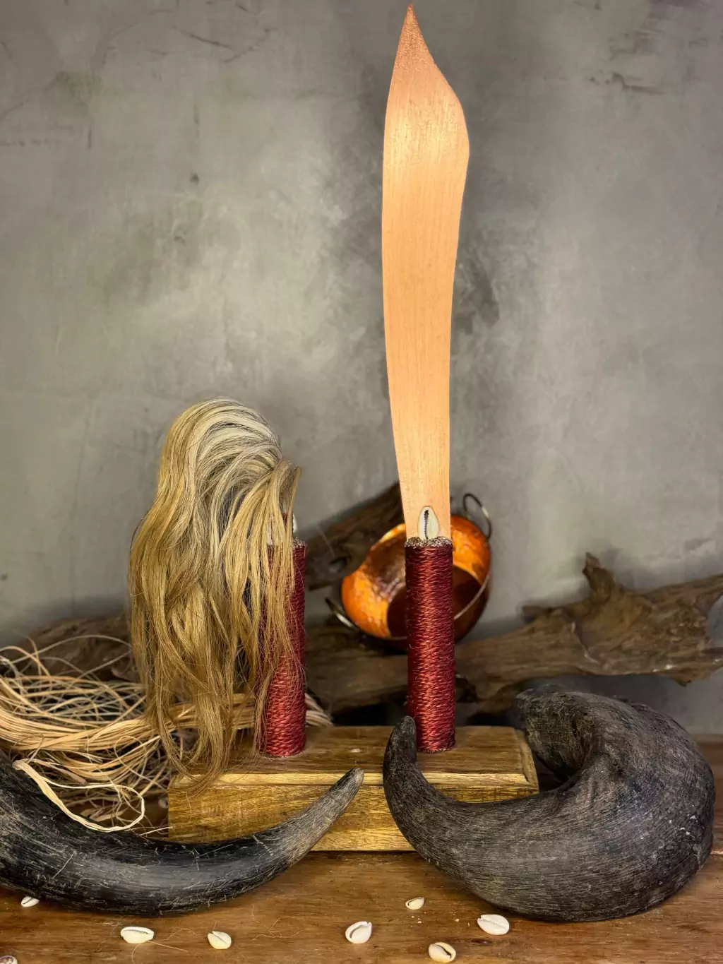 Este conjunto traduz a força impetuosa de Iansã, a senhora dos ventos e tempestades. A lâmina afiada representa seu comando sobre as forças da natureza, enquanto o eruexim, adornado com fios e cabelos naturais, manifesta o domínio sobre os espíritos e a renovação. Os chifres, símbolos de resistência e autoridade, reforçam a presença guerreira dessa Orixá.