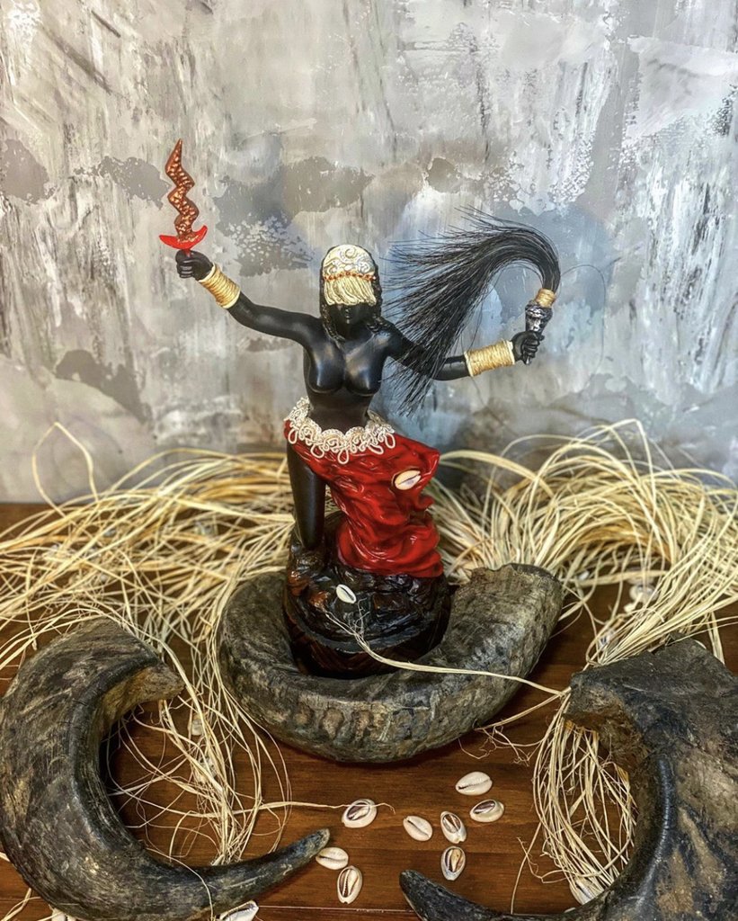 Iansã é ventania que move, gira e transforma. Esta imagem representa sua força em pleno movimento, com espada e eruexim nas mãos. O vermelho vibrante na saia e os detalhes nos búzios evocam seu domínio sobre os ventos e as tempestades.