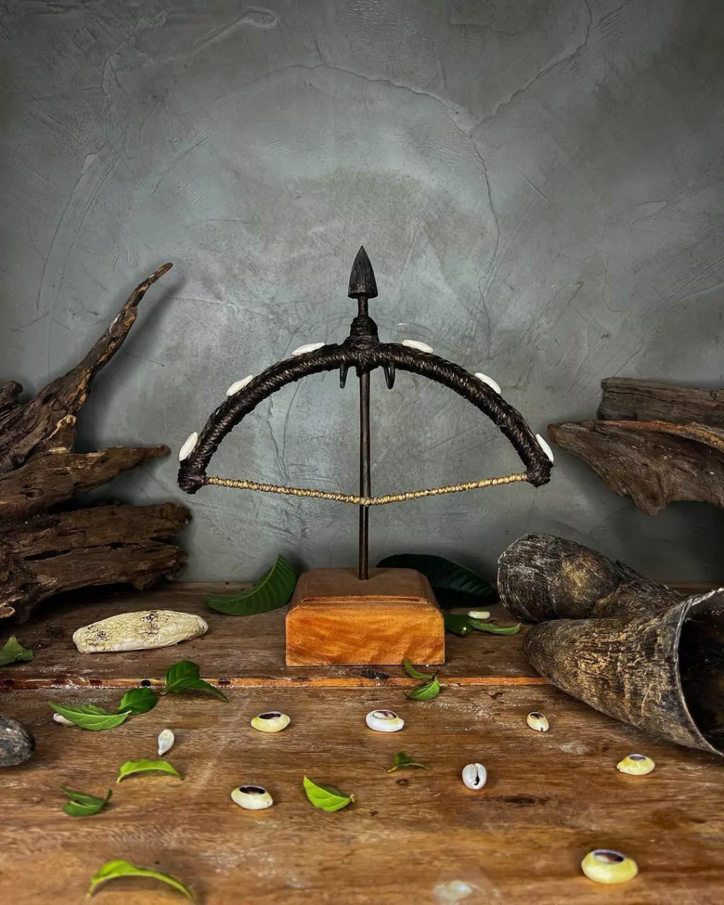 O arco é revestido em fio de sisal tingido na cor marrom, com detalhes de búzios aplicados, trazendo a força dos elementos naturais. A ponta da flecha é feita de chifre de boi, garantindo autenticidade e respeito às tradições.