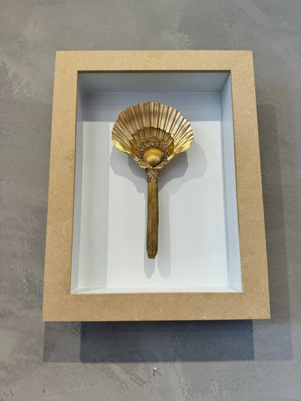 Este quadro traz a miniatura do abebê de Oxum, espelho que reflete a beleza interior, a verdade sensível e a proteção suave. Oxum é Orixá das águas doces, da fertilidade, do ouro e do amor.