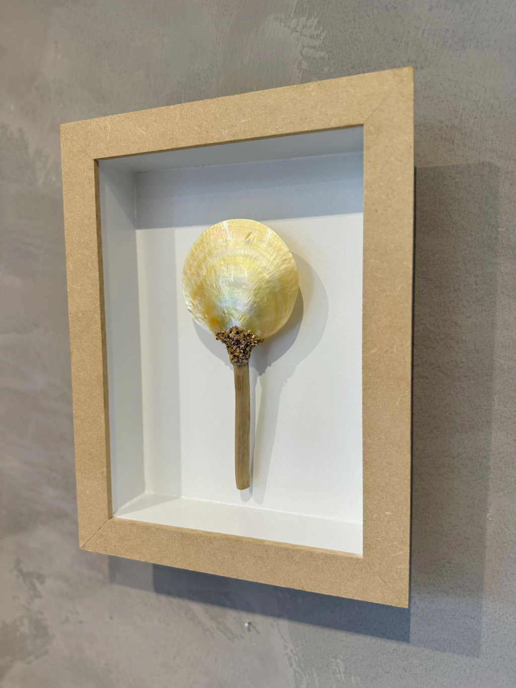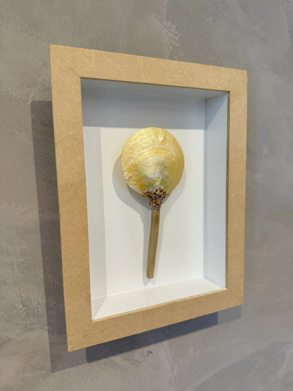 Este quadro traz a miniatura do abebê de Oxum, espelho da beleza sensível, do amor delicado e da proteção afetiva. Oxum é Orixá das águas doces, do ouro e da fertilidade emocional.