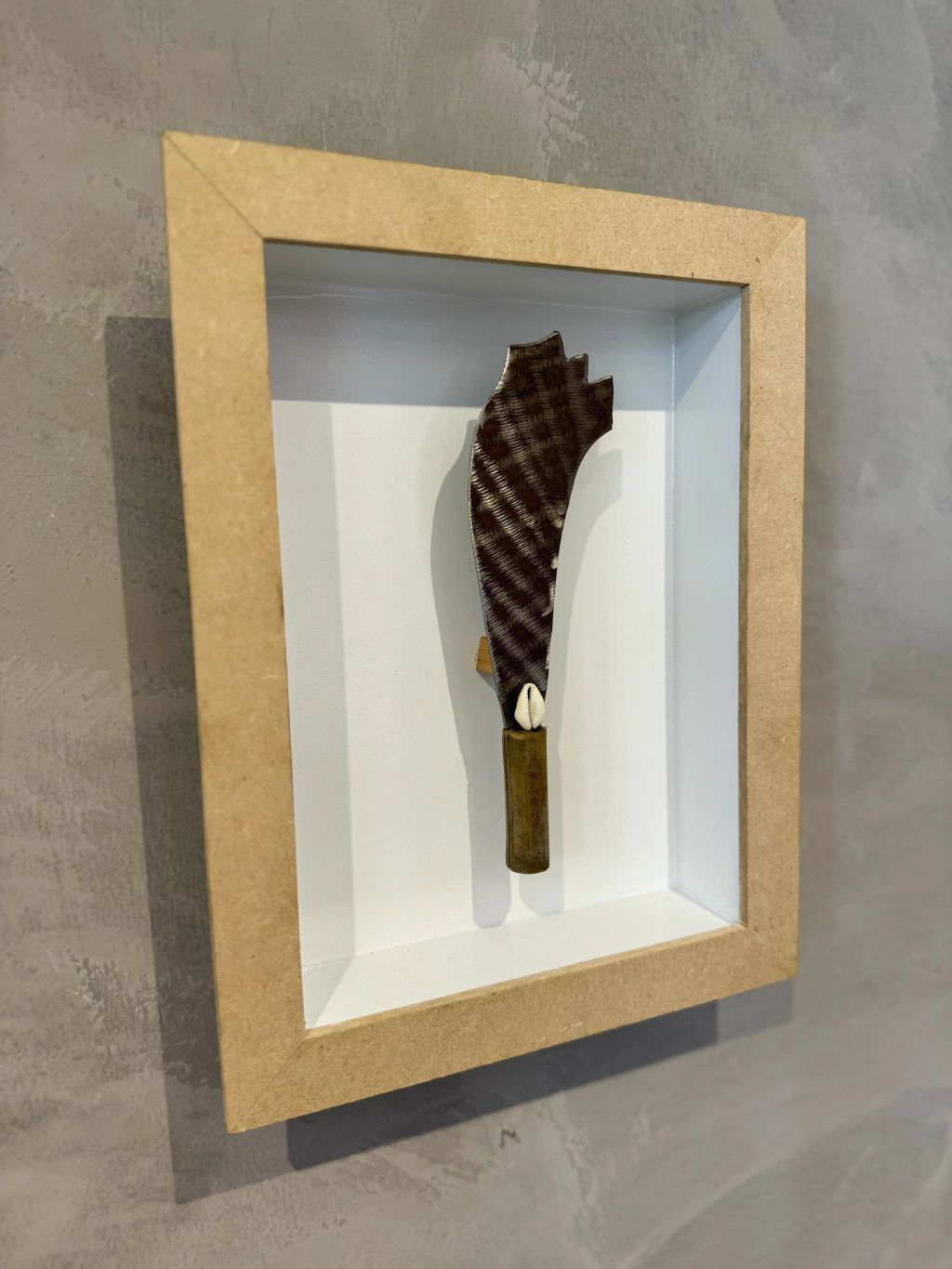 Este quadro traz a miniatura da alfange de Ogum, lâmina guerreira que corta os bloqueios com decisão e avança com força justa. Ogum é Orixá do ferro, da coragem e dos caminhos abertos.