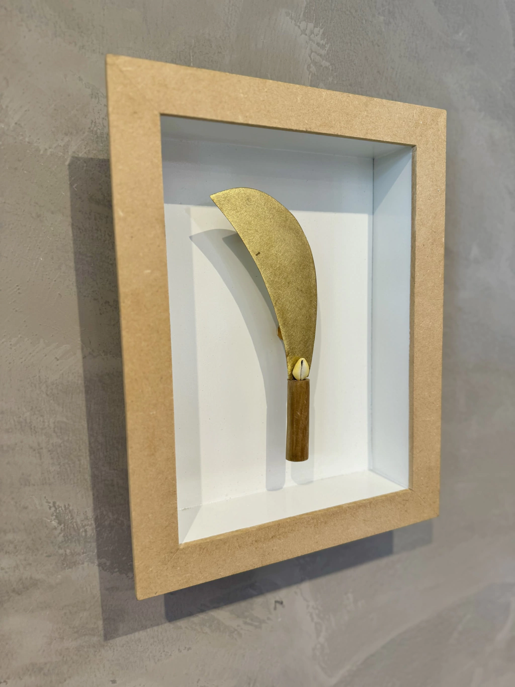 Este quadro traz a miniatura da alfange de Oxum, lâmina da sensibilidade firme que corta com beleza e transforma com leveza. Oxum é Orixá da sedução espiritual, do ouro e da proteção emocional refinada.